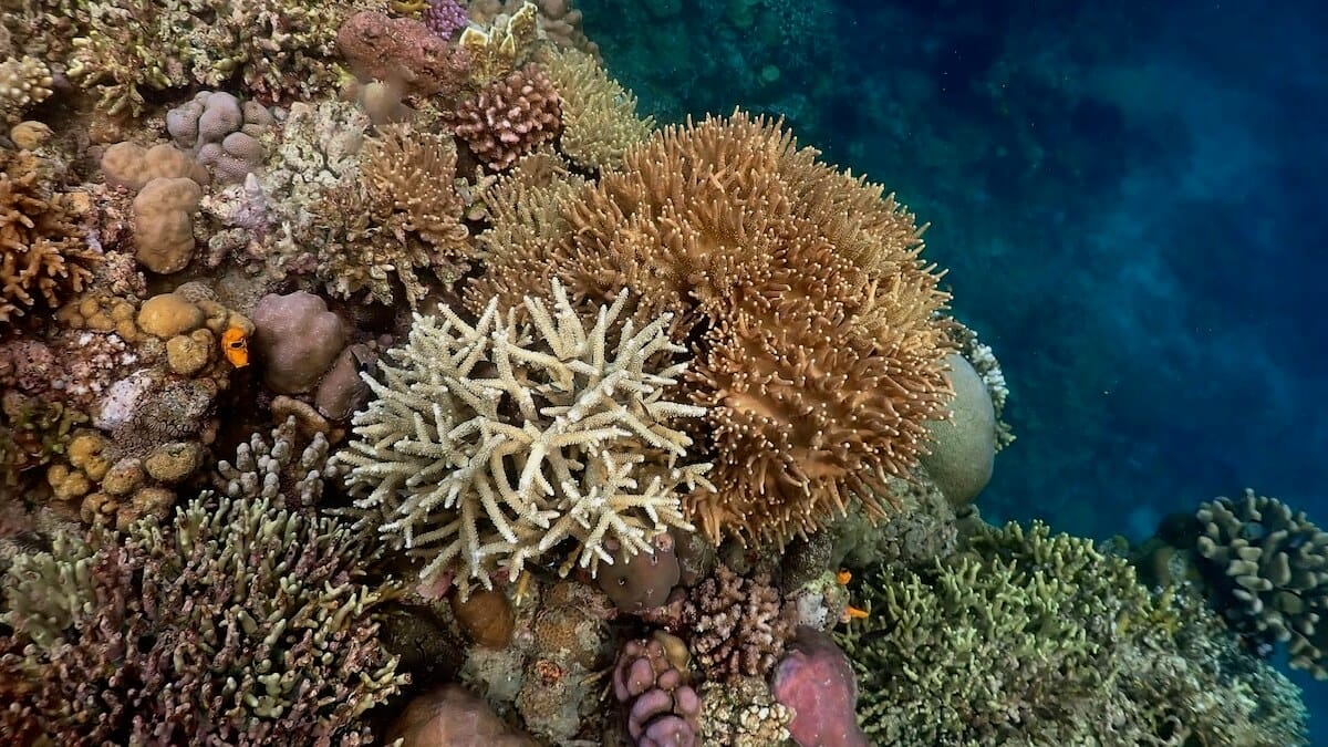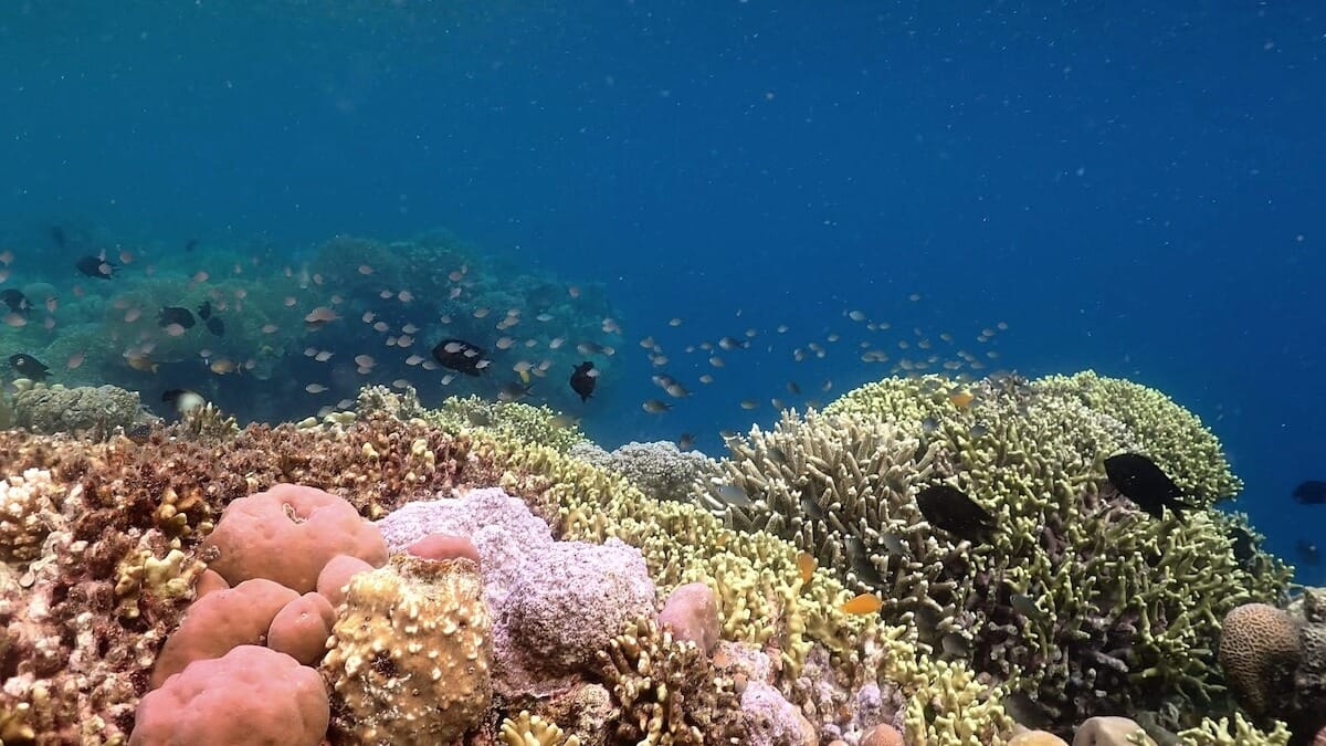 At the edge of the flat, reef slopes gradually descend to deeper areas (↕6-20 feet/2-6 meters), but their coral is in average condition.