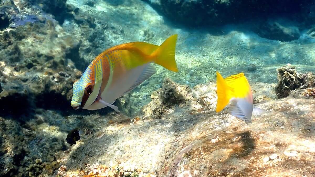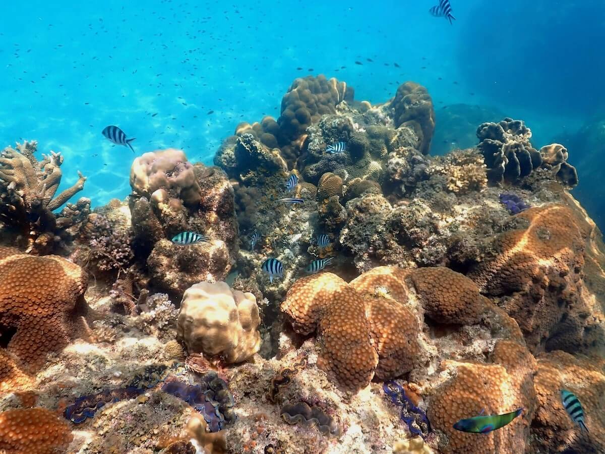 Mango Bay is a relatively open bay, 250 meters wide at beach level and more than 500 meters on the open sea side. The best snorkeling is naturally located on either side of the bay, along rocks. It is in these areas that you’ll see the most corals and fish, in a depth varying between 3 and 15 feet/1 and 5 meters.