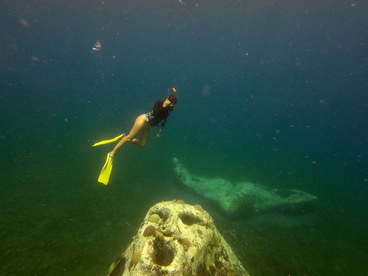 The sculpture is immersed about 6m deep and is surrounded by seagrass beds. It is made up of a head and a caudal fin placed a few meters apart, giving the impression that the creature is partly silted up.