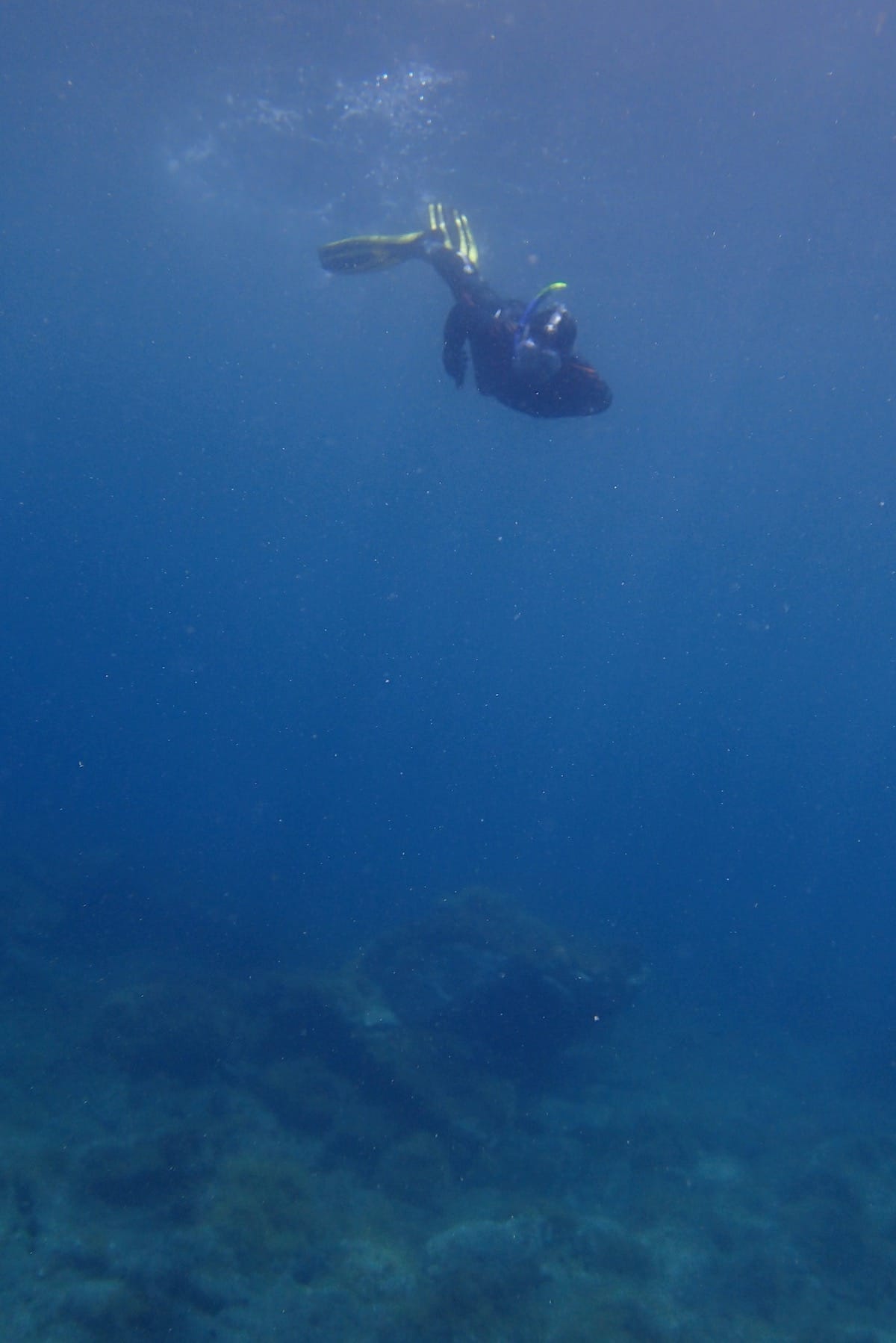 At this spot, the seabed is rocky, with many crevices and overhangs to explore. The depth varies, between 1 to 2m on the shallows near the shore and 3 to 6m between the shore and the rocky outcrop.