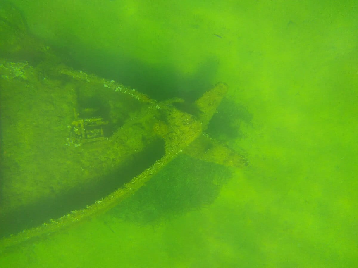 Enter the water from the beach, in the center of the stone wall (see map above). You will be roughly opposite the wreck.