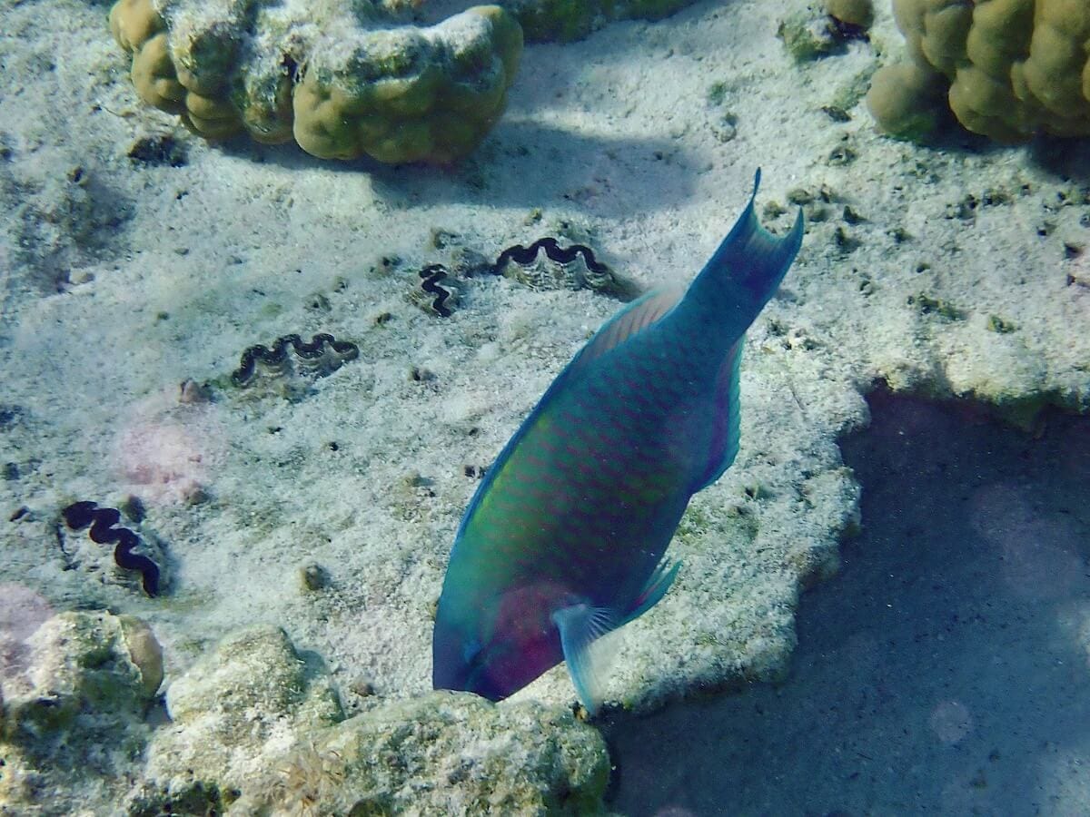 This part of Matira Beach is arguably the most beautiful, with its pristine sandy beds bathed in translucent turquoise water. Here, the seabed is not spectacular at all, but you can still spot schooling yellow goatfish, a few butterflyfish and surgeons sheltering near the small rocky areas. There are also beautiful stingrays which come and go along the beach (↕1-6 ft/0.5-2 m).