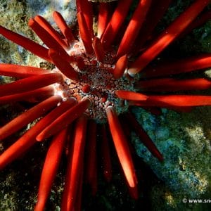 Different species of sea urchin, including the bright red pencil urchin, also inhabit the seabed.