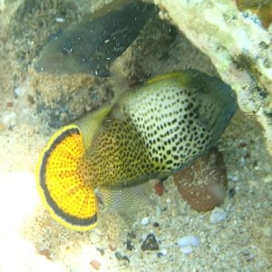 Near the beach, you’ll snorkel above rocky coastal benches, on which only a little coral has taken up residence. Many fish swim in this area. Yellow longnose butterflyfish and several other varieties of butterflyfish, as well as the highly colorful fantail filefish are always ready to have their photo taken, which is made easier by the clarity and luminosity of the water.