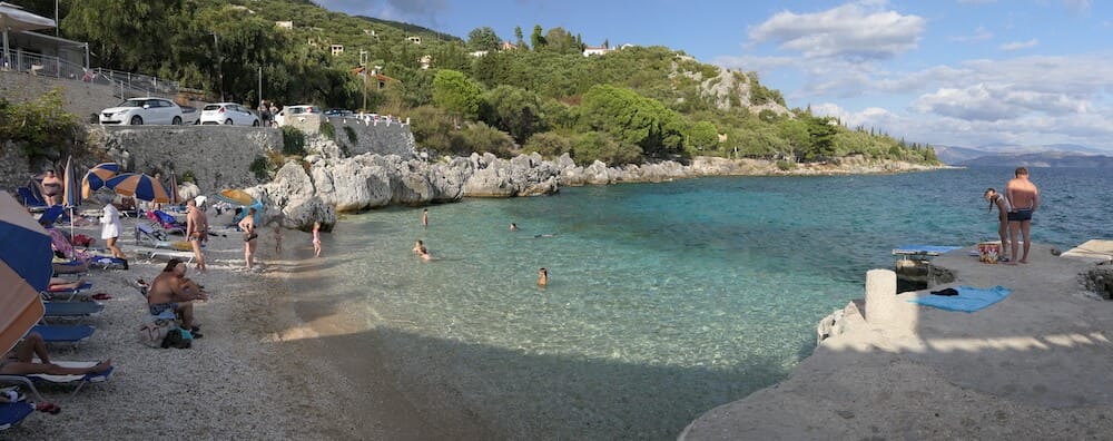 Nissaki is a small but beautiful rocky cove located on the northeastern coast of Corfu, with crystal-clear azure waters and views across to Albania. A taverna sits atop the rocks to one side where the staff and customers often throw bits of food into the water keeping the fish well fed and close to shore.