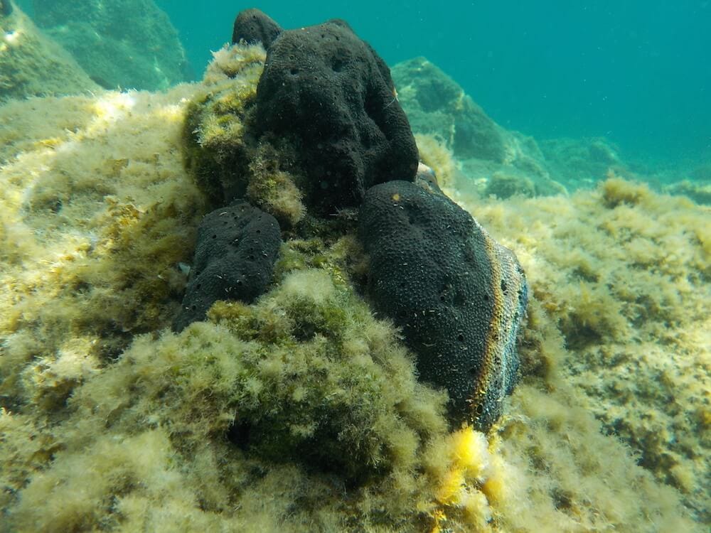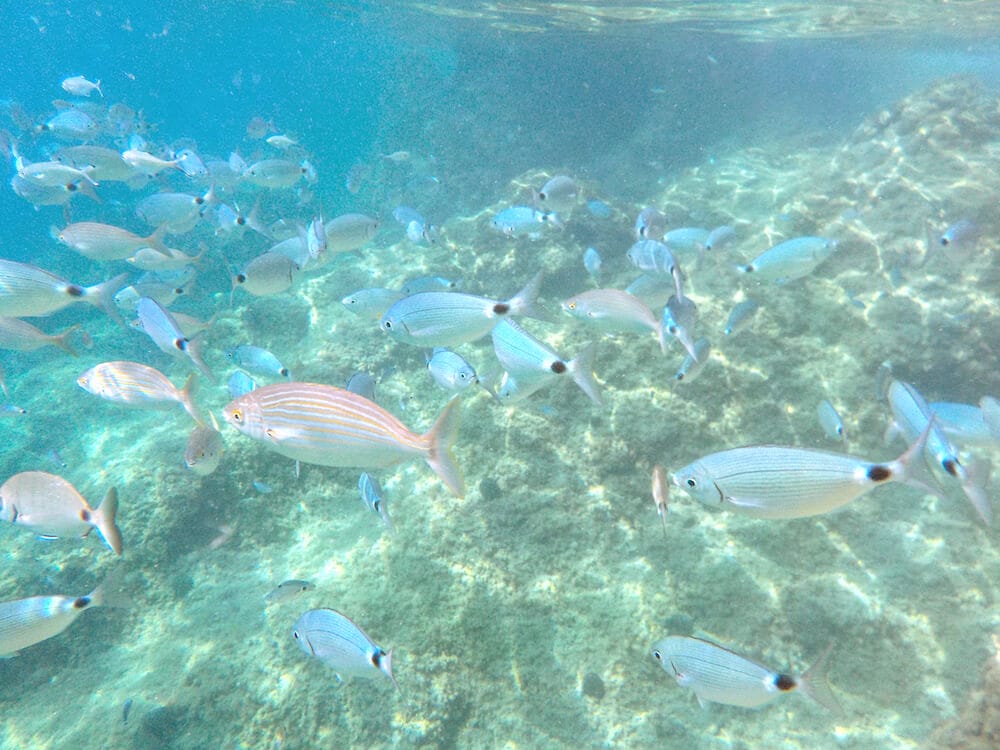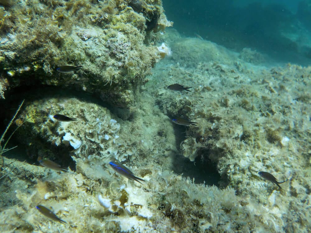 There are large shoals of good-sized fish under and around the corner of two platforms on the right side of the beach, but there are also sometimes vast shoals of fry and other fish just a few meters of shore. The rocky shore to the left is interesting to explore, but with fewer fish species. Large, black sponges cling to rocks and further out there are a few glades of sea grass.