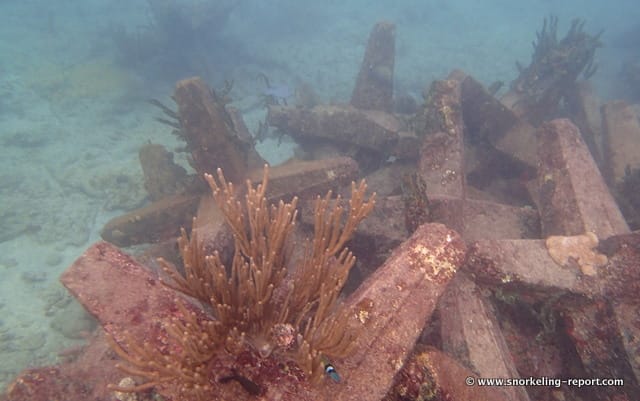 Make sure to swim above the tripods (↕10-20ft/3-5m). Although the reef has been colonized by a few sea fans and a little soft coral, it still looks a bit artificial.