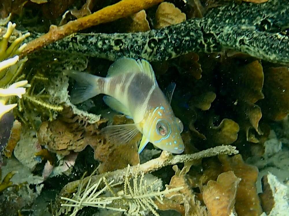 Area 2 has the greatest variety of open water fish species. In area 3, the water is largely shallow, with sand and some coral debris. If you swim out you will reach a large reef feature including live coral.