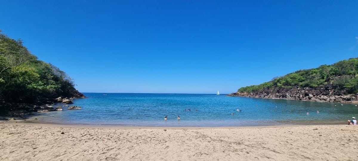 The 100-meter-long beach of Petite Anse, lined on either side by rocks and shaded by lush vegetation, opens on to a small cove with calm, turquoise waters. It has one of the best shore snorkeling in Basse Terre, the western part of the butterfly-shaped island of Guadeloupe. A wide variety of fish inhabit the cove, as well as sea turtles, sometimes spotted feeding on the seagrass bed.