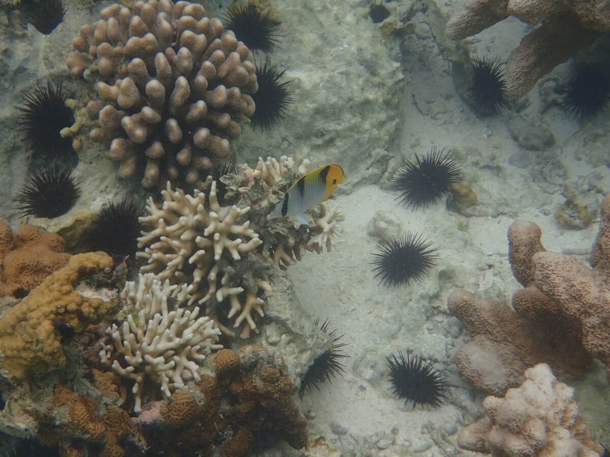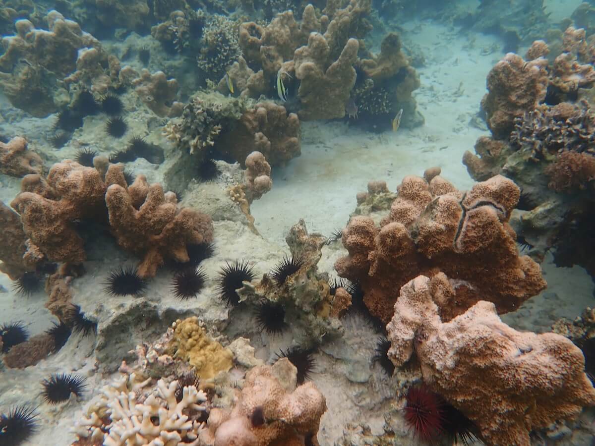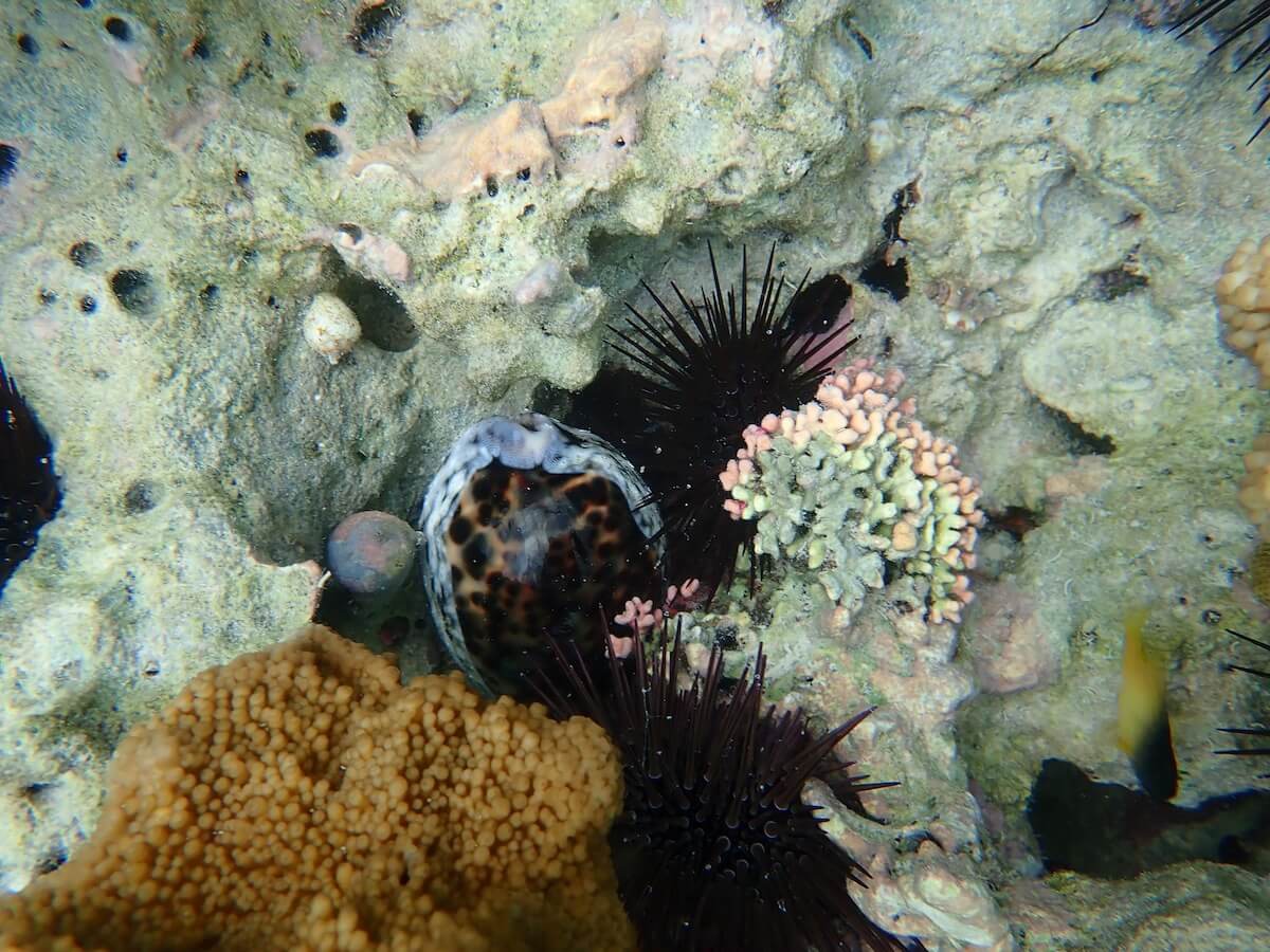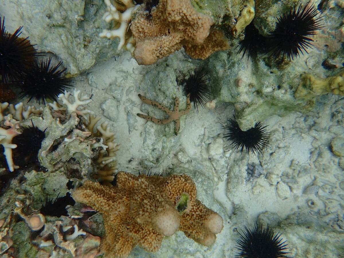 The small reefs feature a variety of hard corals, soft corals, sponges and sea anemones. Many sea urchins, giant clams and starfish live around the coral heads, in which coral-banded shrimp often hide.