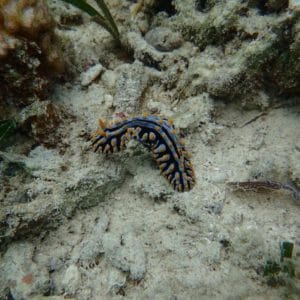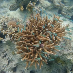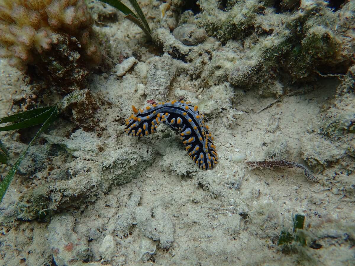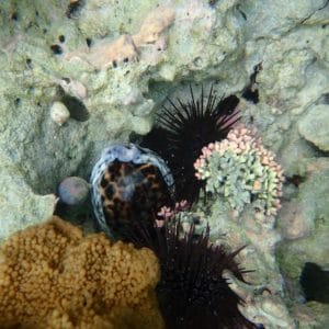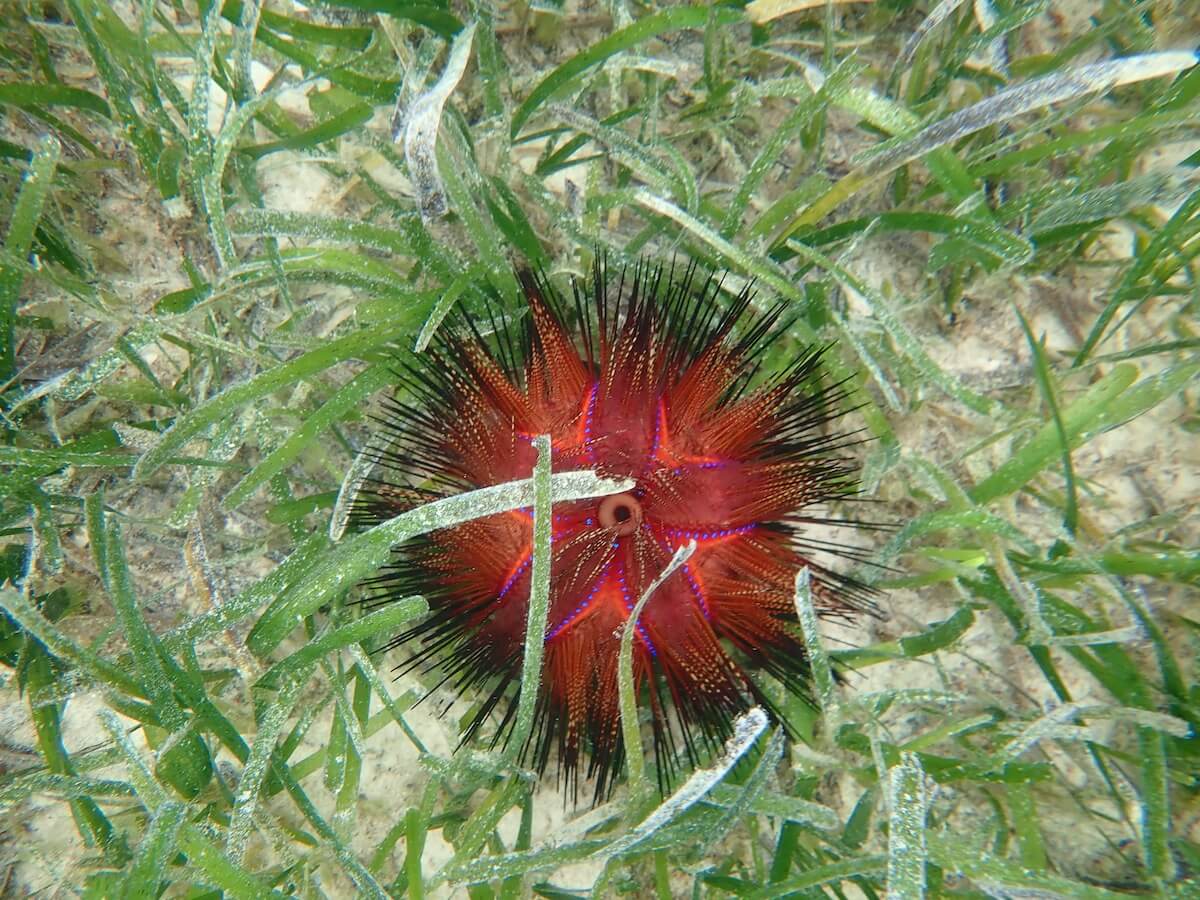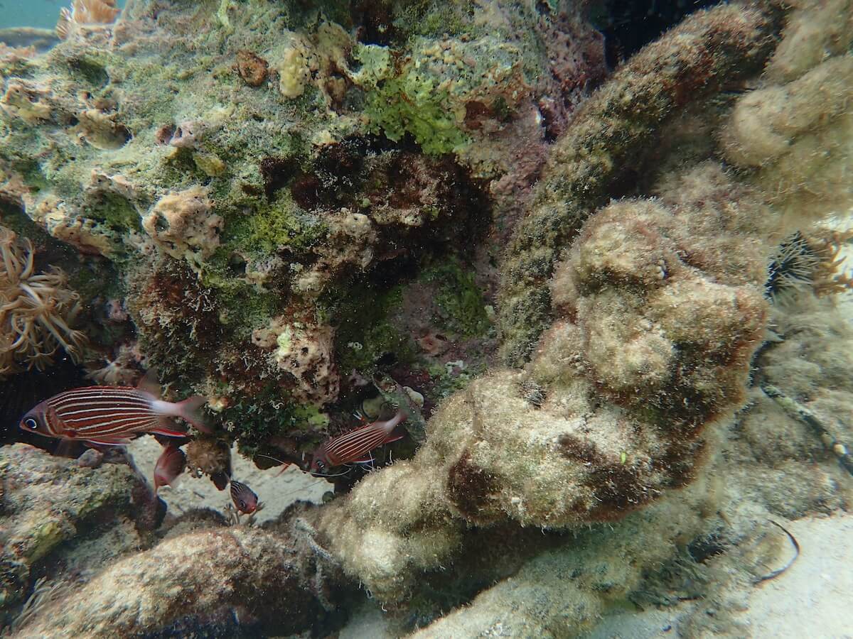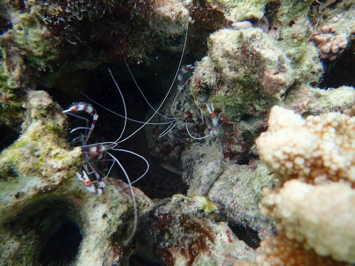 The small reefs feature a variety of hard corals, soft corals, sponges and sea anemones. Many sea urchins, giant clams and starfish live around the coral heads, in which coral-banded shrimp often hide.
