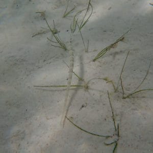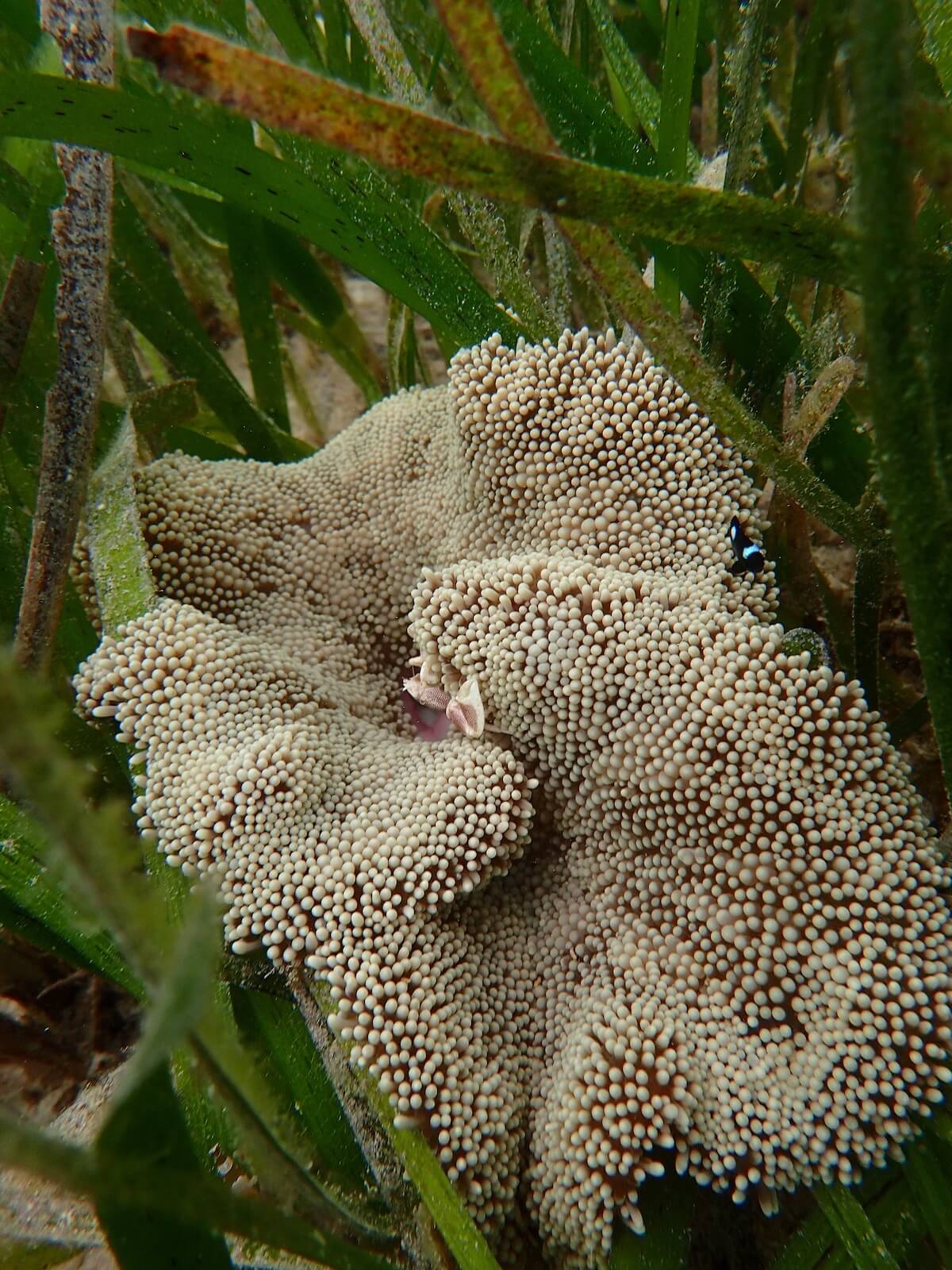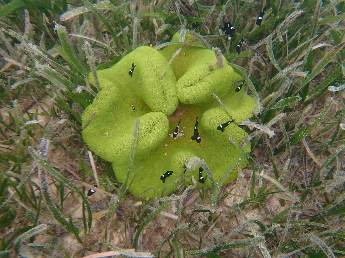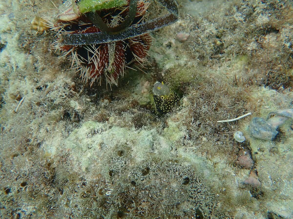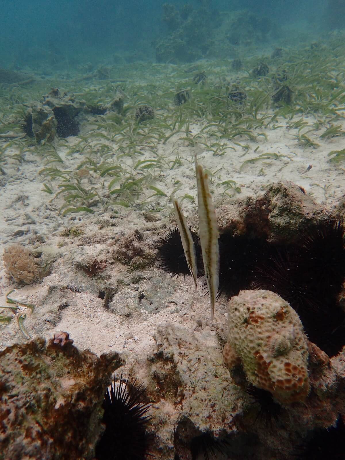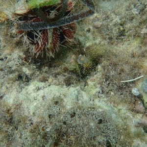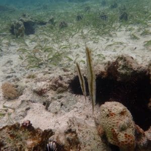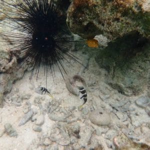 The seagrass allows encountering specific species such as the tiger snake eel, the fire sea urchin, or the Mertens’ carpet sea anemone, in which porcelain crabs, threespot dascyllus and twobar clownfish often hide.