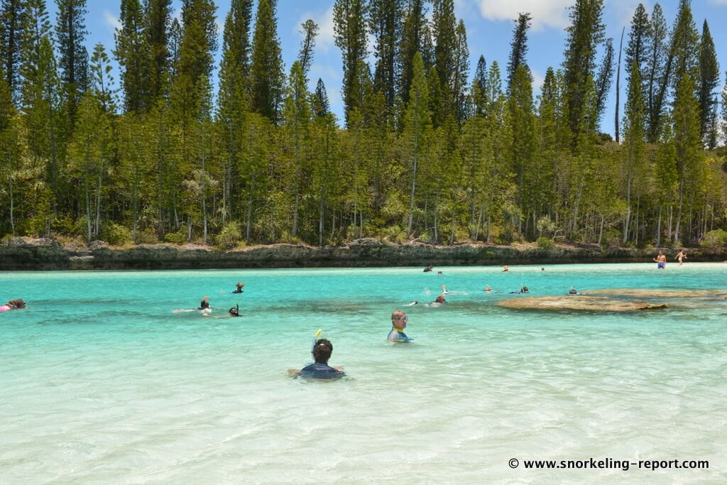 1. Access by road. Reach the small parking at the end of the road to Oro Bay (well indicated) by car or with a shuttle, whcih can be booked through your accommodation. Pay the entrance fee (CFP200 per person) at the hut, and then walk down the paved road (10 minutes) until you reach the channel. From there, cross the channel (at low tide the channel is dry, while at high tide, you will have water up to the knee), and follow the small path made in the forest to reach the pool (20 minutes). The pool is indicated by blue signs.