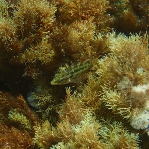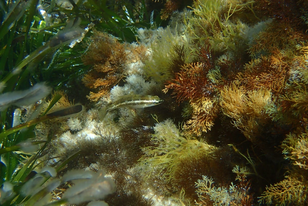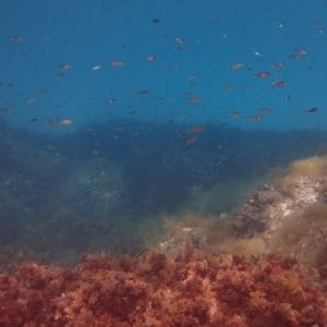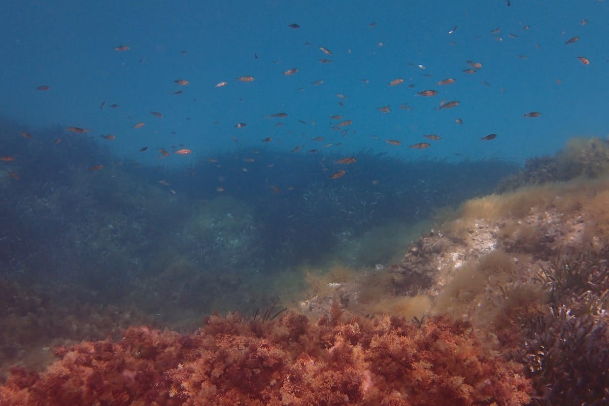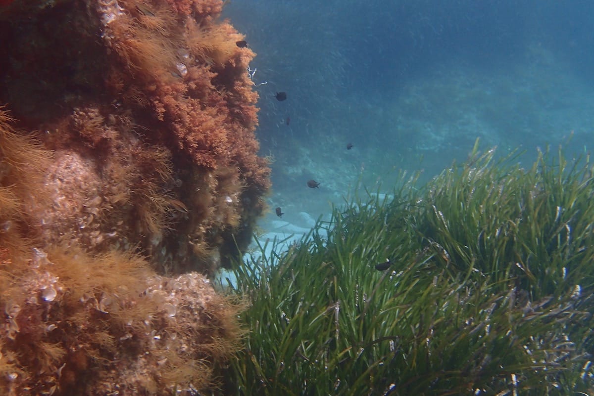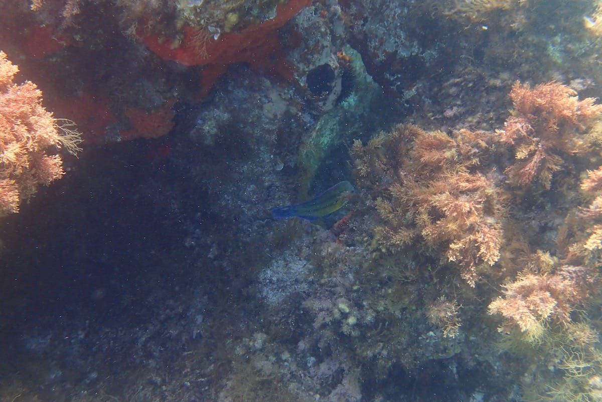 Several wrasse species, such as the brown wrasse, the ocellated wrasse, and the East Atlantic peacock wrasse also live hidden in the seagrass. If you’re lucky, you might also come across a Mediterranean moray, often reported here. In the eastern side of the spot, near the Posidonia meadows, red starfish are also pretty common (↕6-12ft/2-4m).