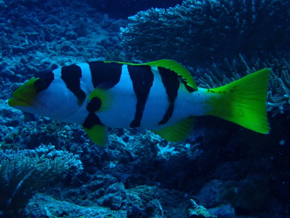 On the drop-off, the seabed is exceptional. In the presence of the density and variety of the underwater life here, sometimes you will not know which way to look. Swim along the reef edge and, here and there, you will surely spot a reef triggerfish, a powder blue tang, a moray hidden in rocky crevices or small groups of skunk clownfish “playing” in their anemone.