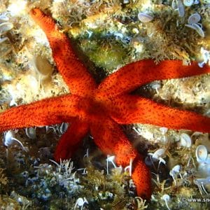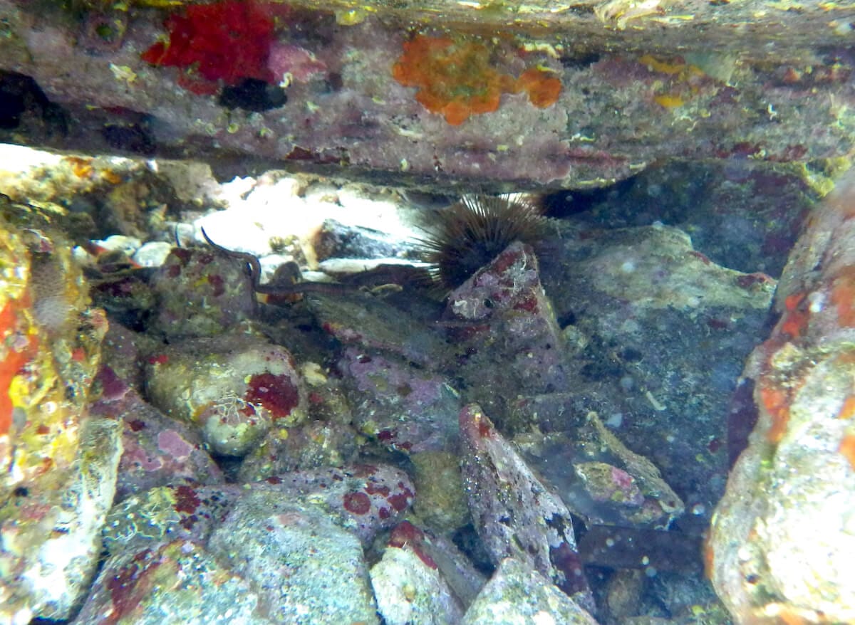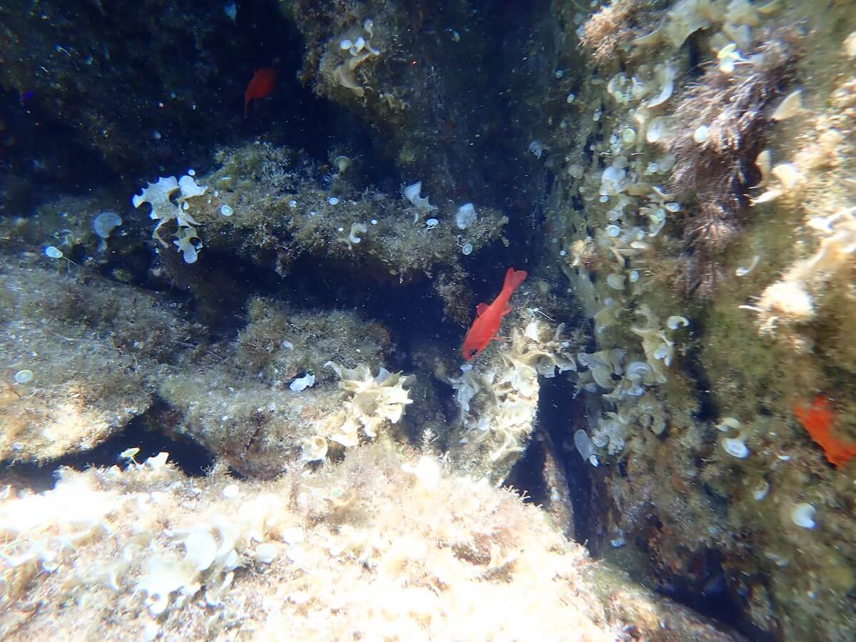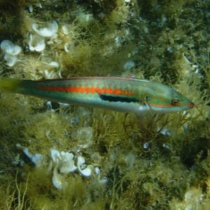 In the rocky areas it is easier to come across the highly colorful Mediterranean rainbow wrasse, the ornate wrasse, and the painted comber. Explore the small crevices to find red starfish, which are quite common at this spot.