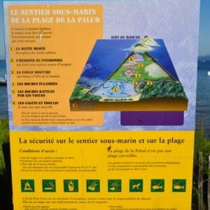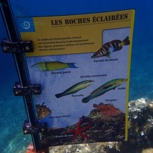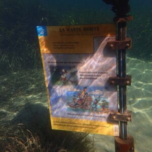 Each buoy indicates a specific underwater environment. They include a sandy seabed, a Posidonia seagrass bed, a rocky rift, rocks beaten by the waves, etc. It also includes an information panel to be read underwater.