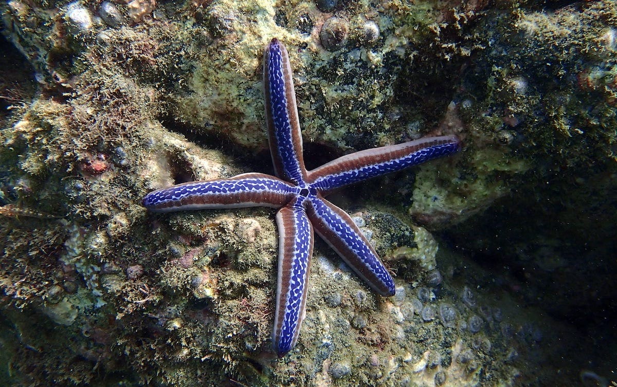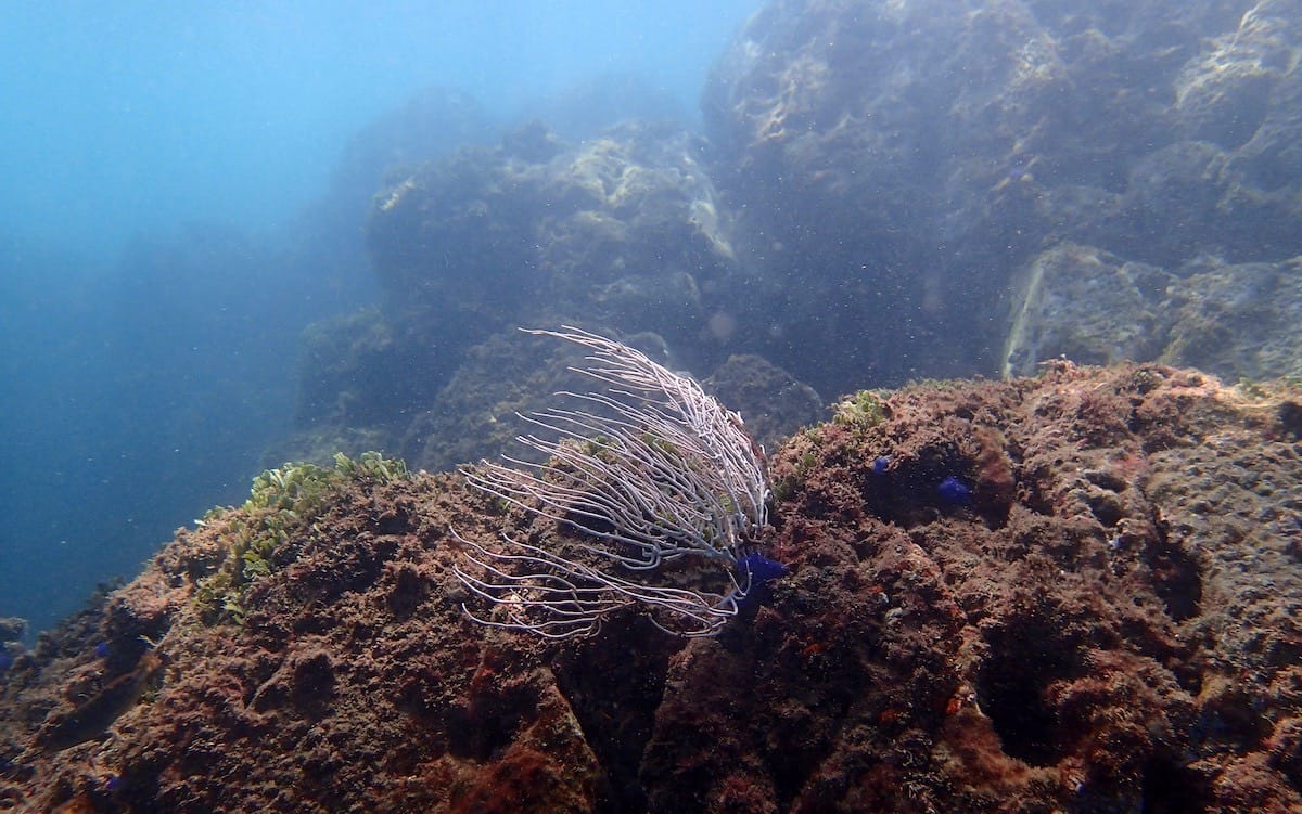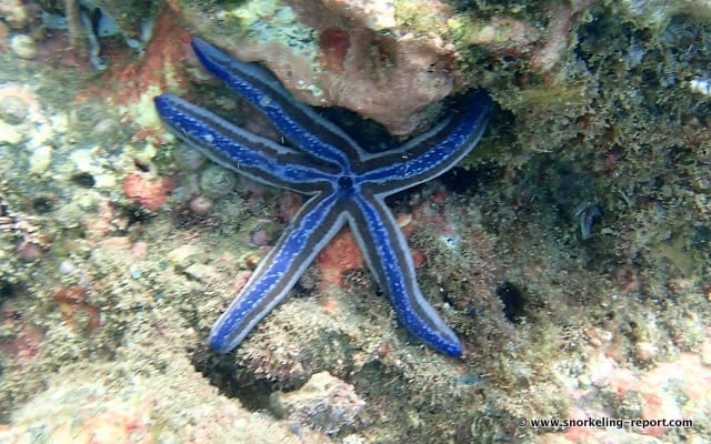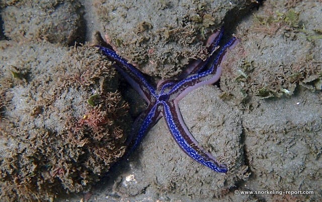 In the designated snorkeling areas, the seabed is rocky, covered in places with Caulerpa seaweed. Gorgonians are sometimes found on the rocks. Galápagos blue sea star and long-spined sea urchins are very common here.