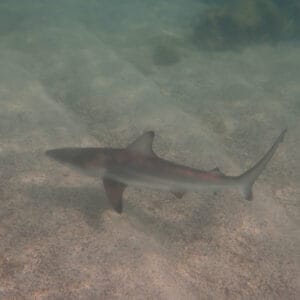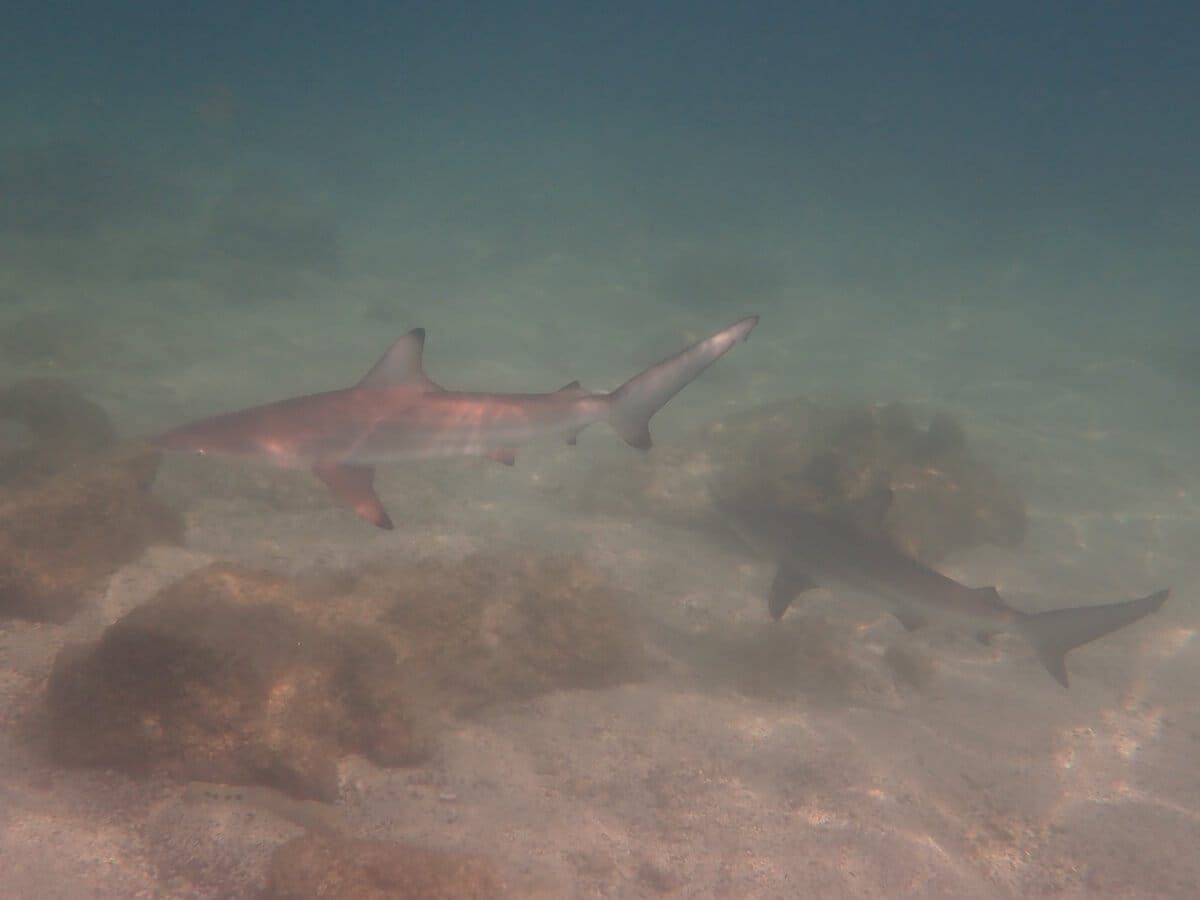 At certain times of the year, which are difficult to predict, small Galápagos sharks settle by the dozen in the bay.