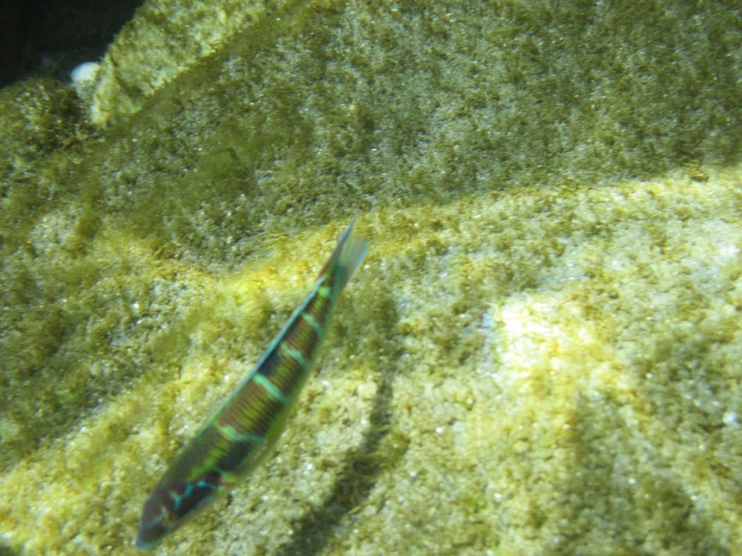 In the area, the seabed is rocky, sprinkled with small patches of Posidonia (↕6-12ft/2-4m). Life is at its most abundant along the rocky outcrops on either side of the bay. It is easy to come across the highly colorful Mediterranean rainbow wrasse, ornate wrasse, or the painted comber.