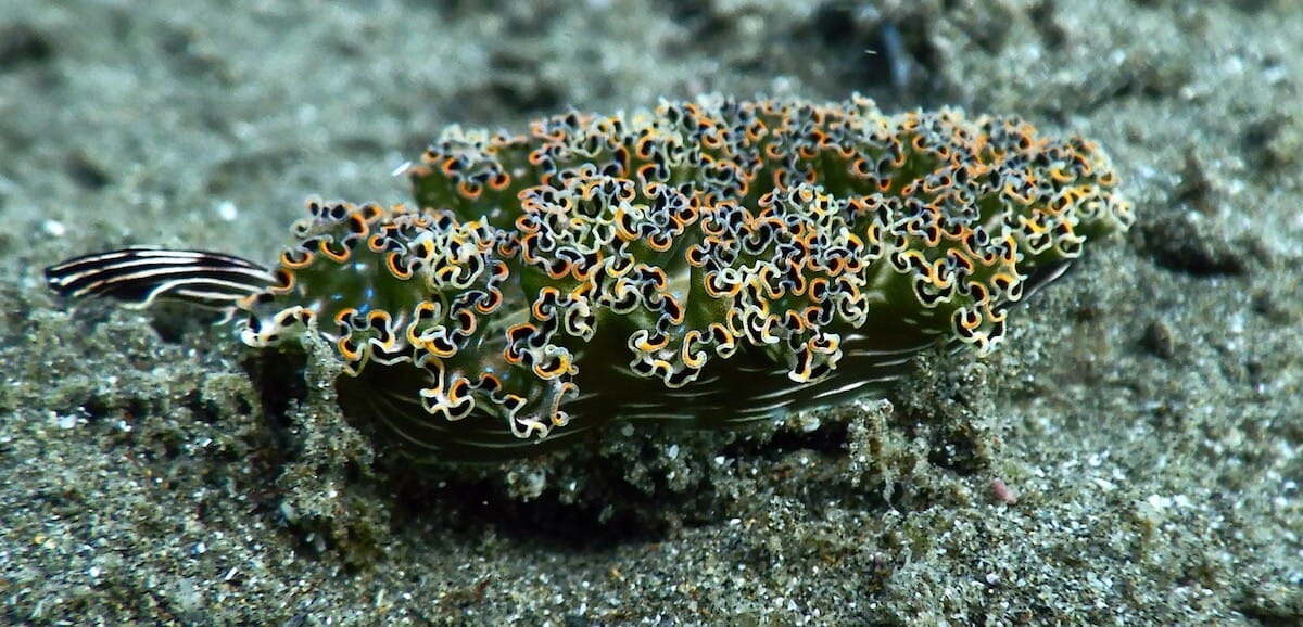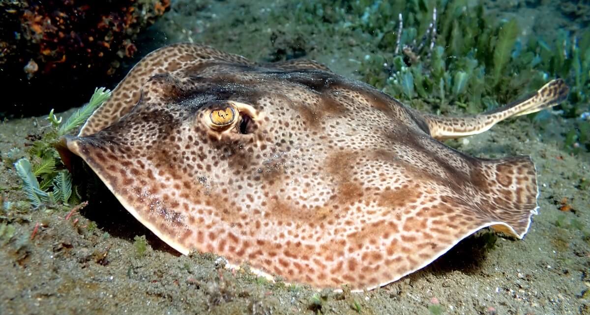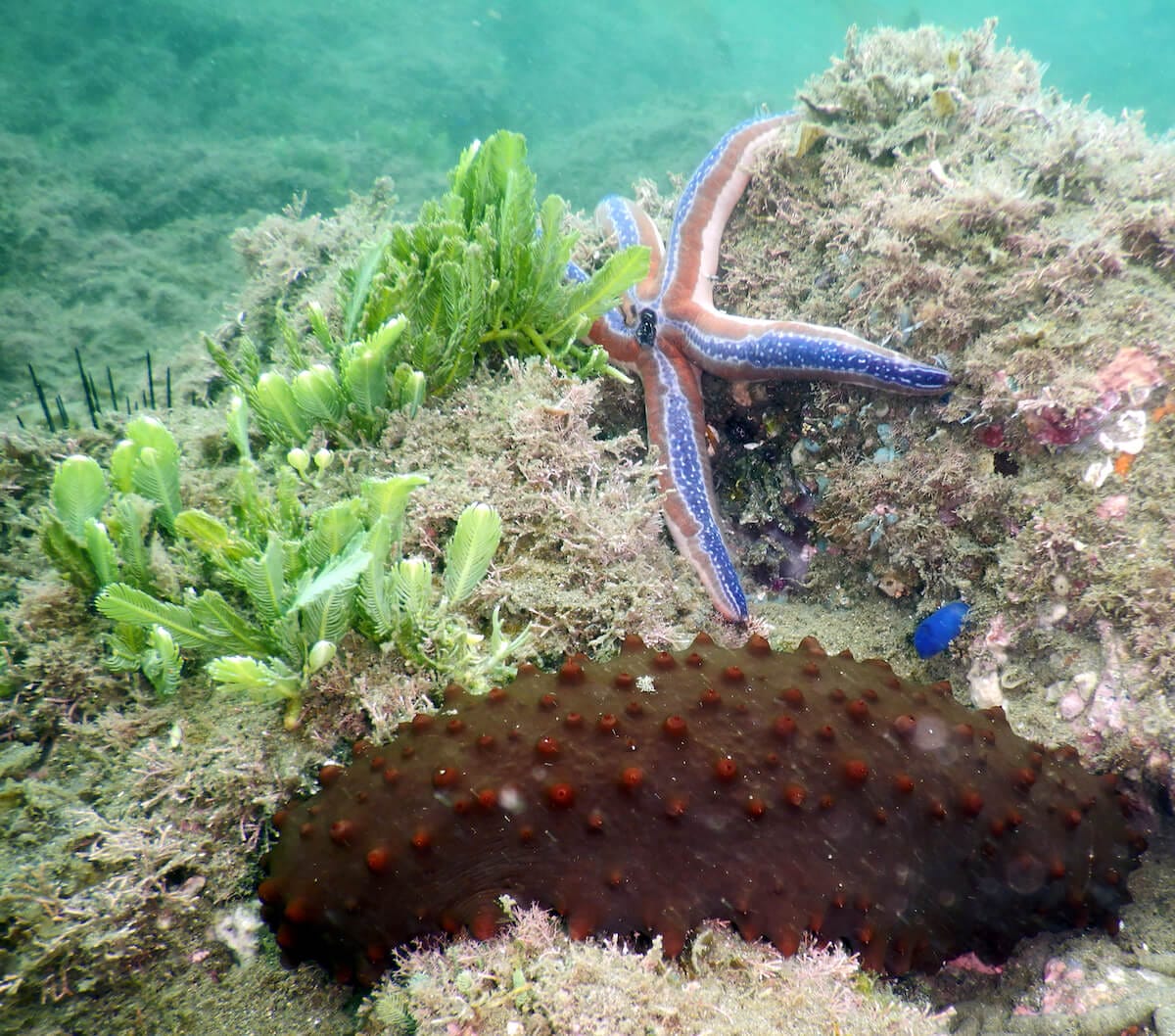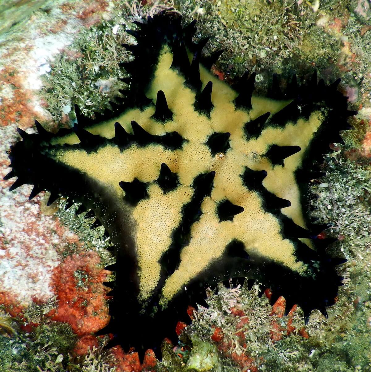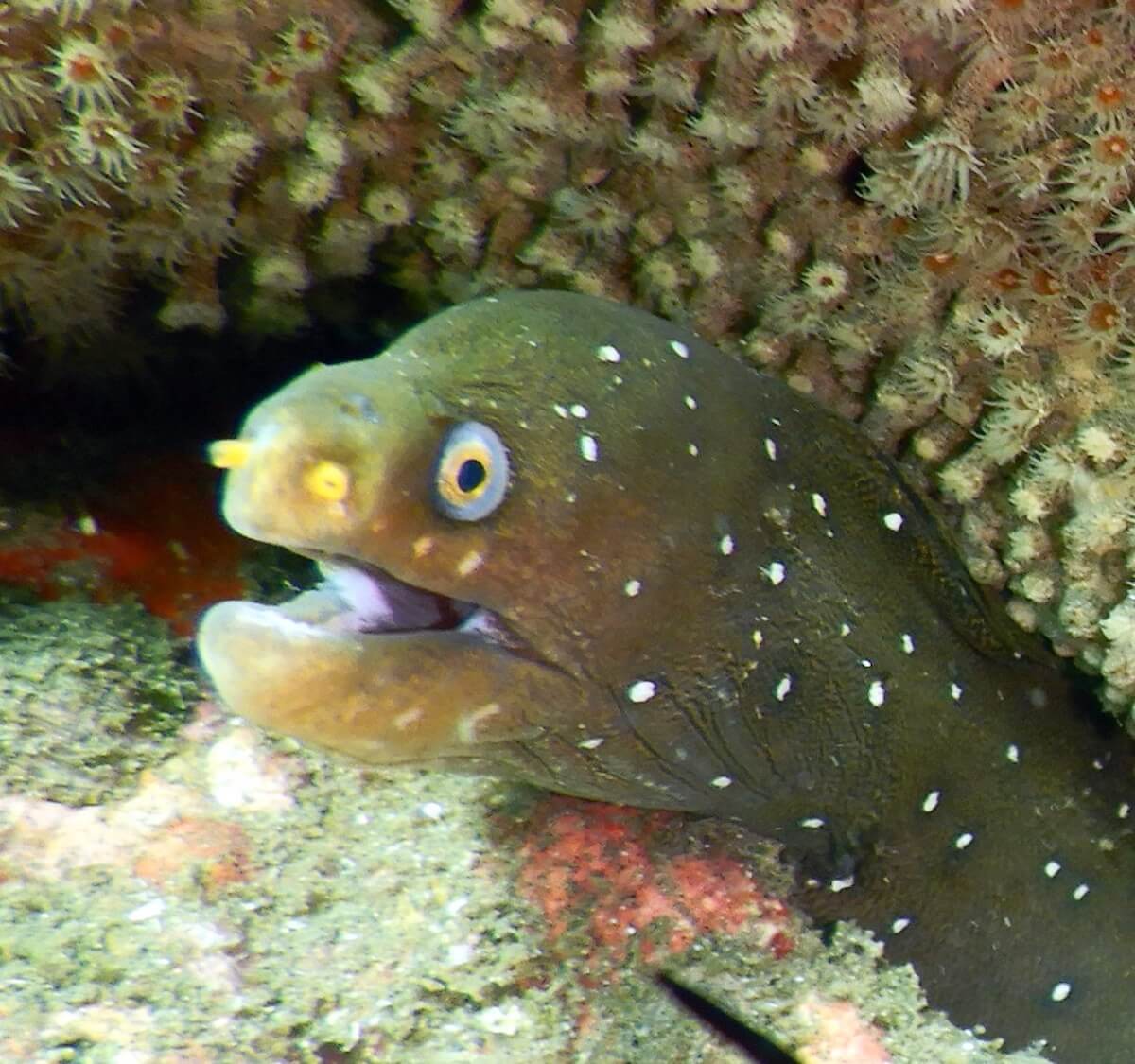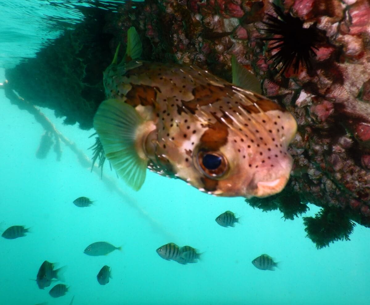 Hawksbill sea turtles can be found sleeping in the crevices, starfish abound, as well as several species of puffers and porcupinefish. Stingrays can be found in the sandy-bottomed areas to the left and right.