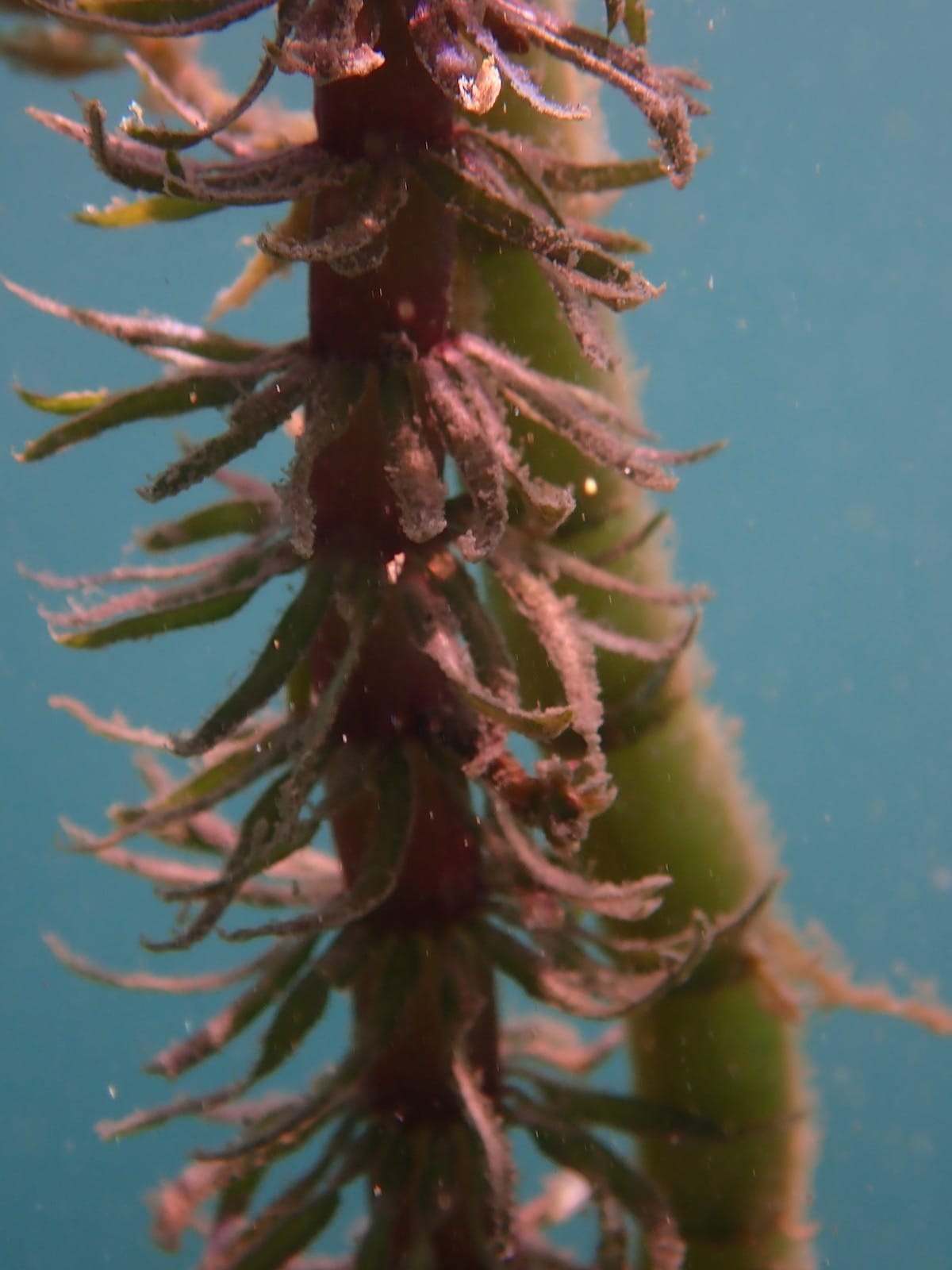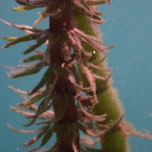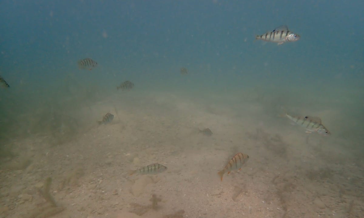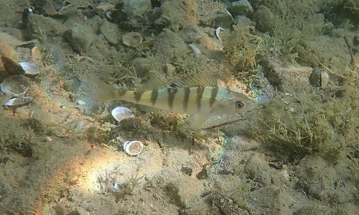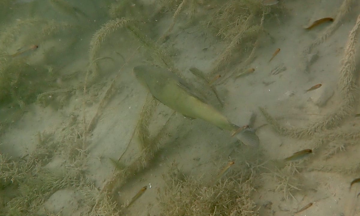 Underwater, the shore extends into a steep drop off. In places, you’ll find fields of aquatic plants (Myriophyllum sp.), in which fry and juveniles of several species of fish hide.