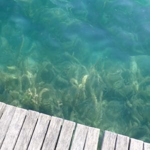 You can enter the water either from the pontoons that line the shore at this part of the lake (and which gave the site their name), or from the rocks.