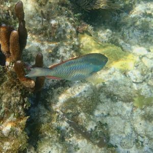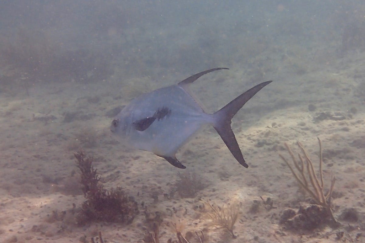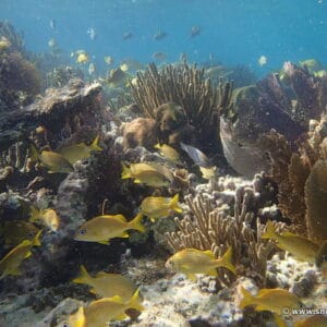 The barrier reef hosts a fantastic diversity of fish including hundreds of Sergeant major, shoals of French grunt, as well as several species of Butterflyfish and Parrotfish.