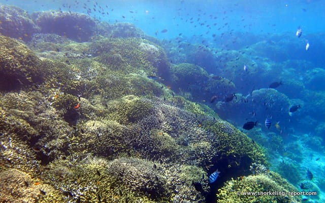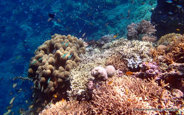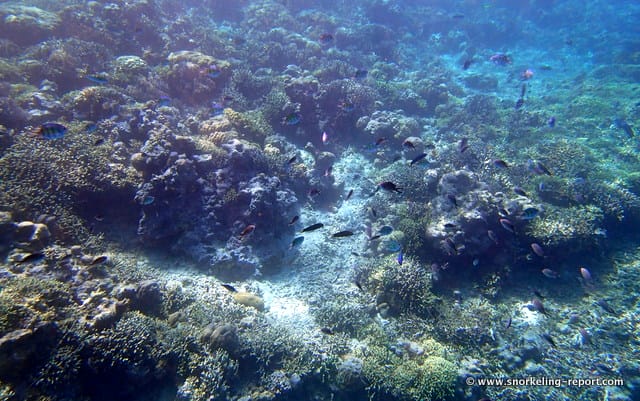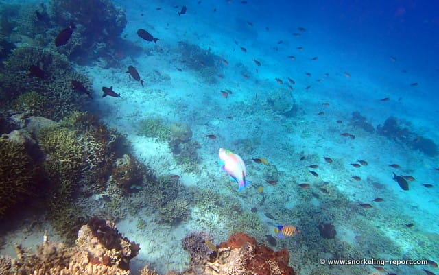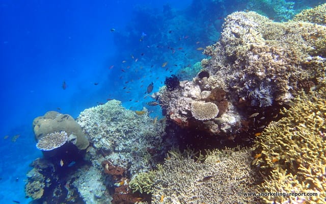 Although there are interesting things to see on the reef flat including batfish, giant clams and blue sea stars, the best snorkeling is found when you get closer to the reef drop-off.