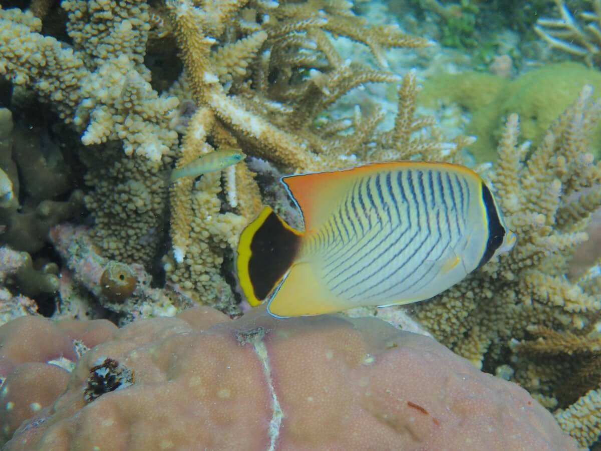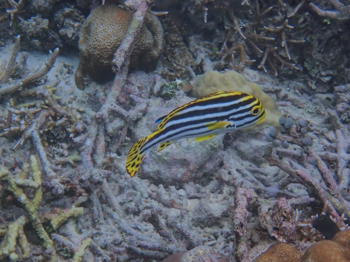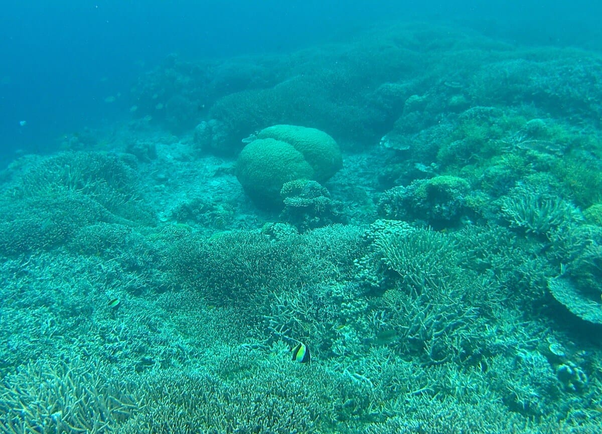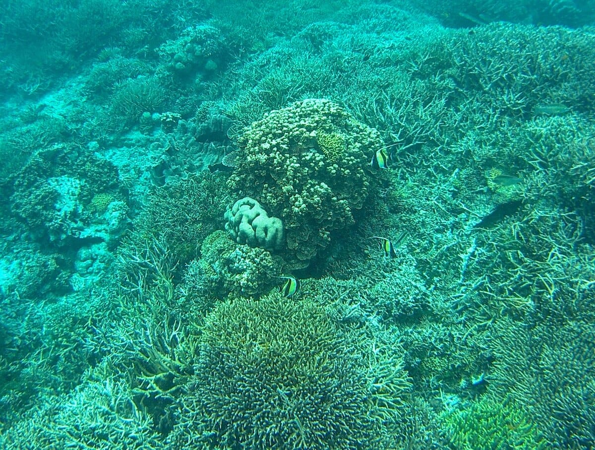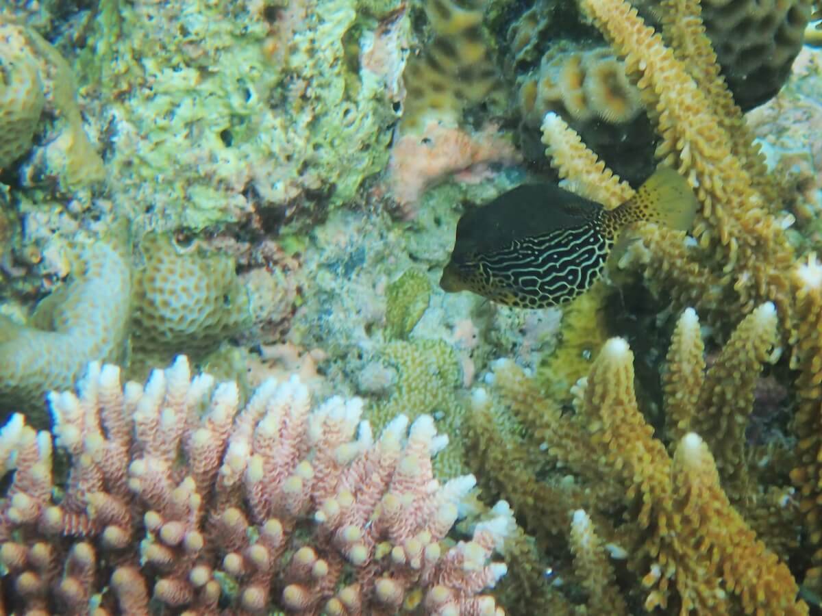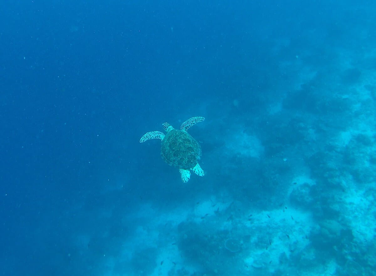 The island is entirely surrounded by a coral reef. Along the western and eastern sides of the island, this majestic reef is covered with hard corals and populated by an interesting amount of fish with the occasional sight of green turtles.