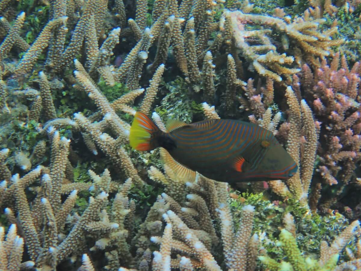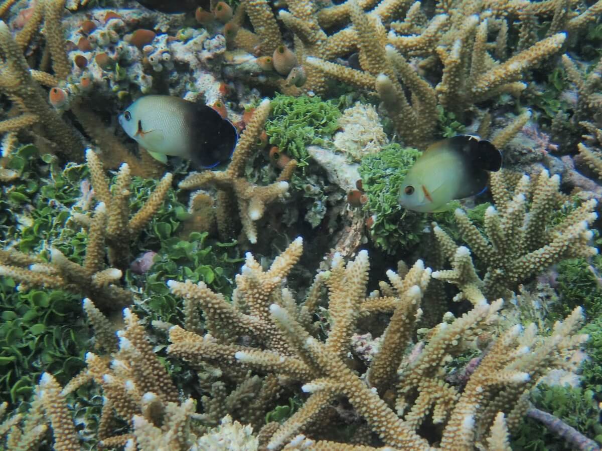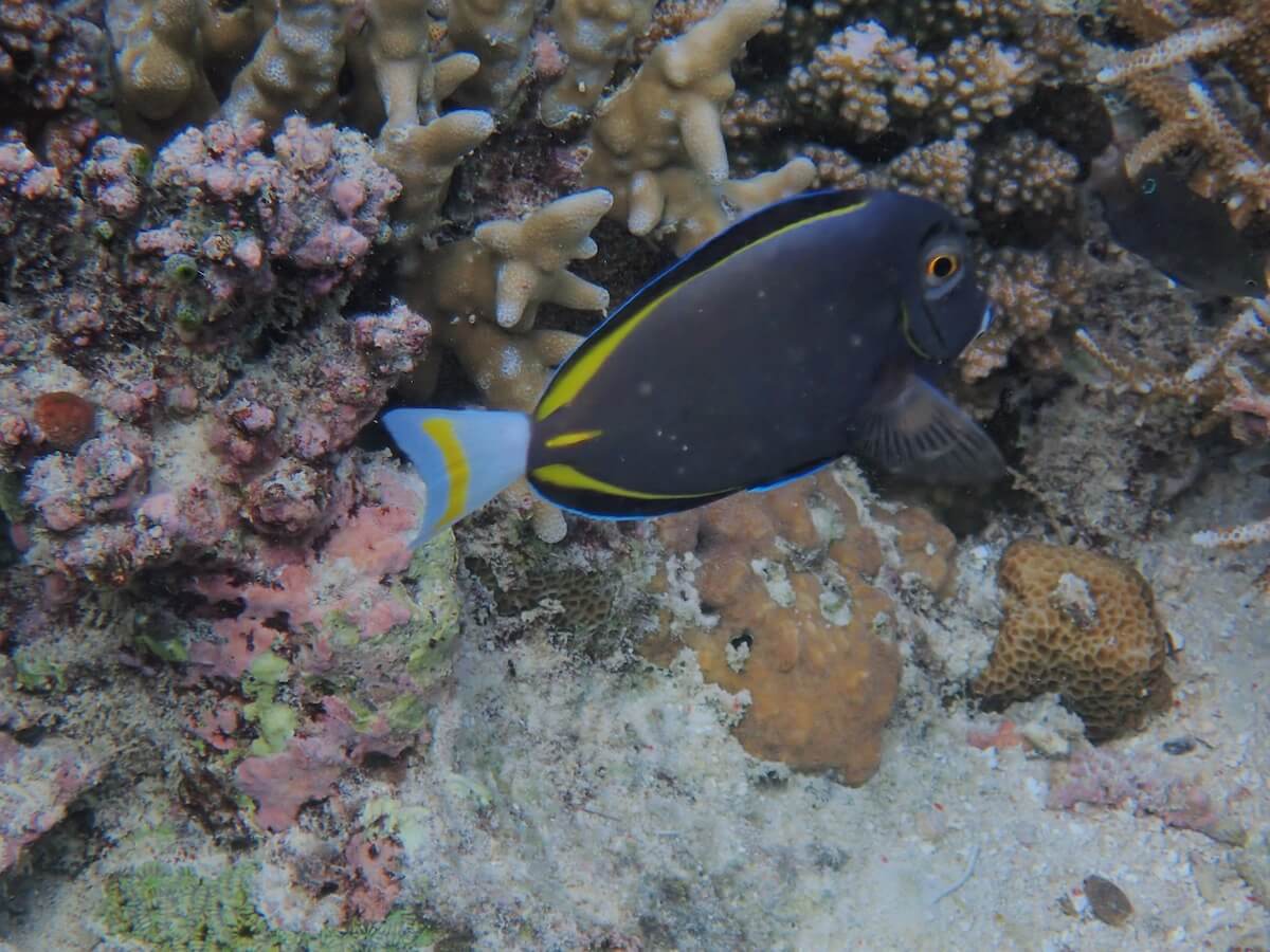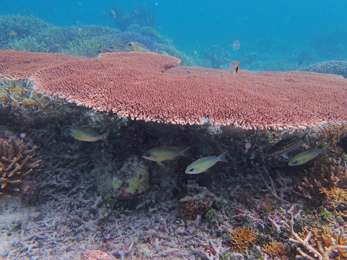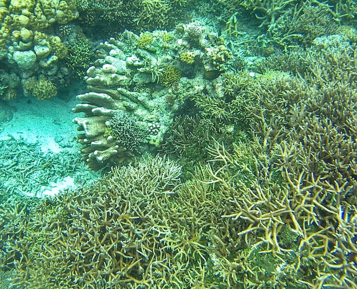 The island is entirely surrounded by a coral reef. Along the western and eastern sides of the island, this majestic reef is covered with hard corals and populated by an interesting amount of fish with the occasional sight of green turtles.