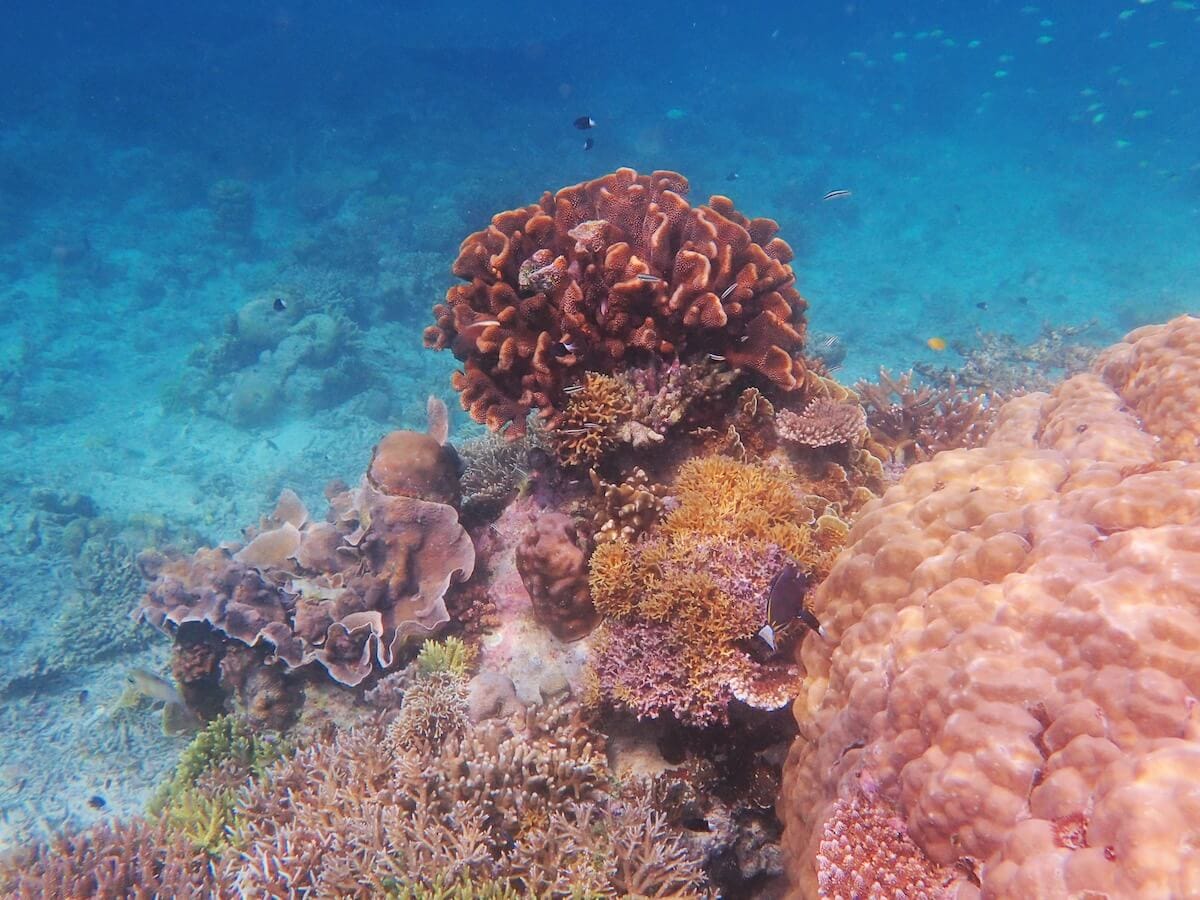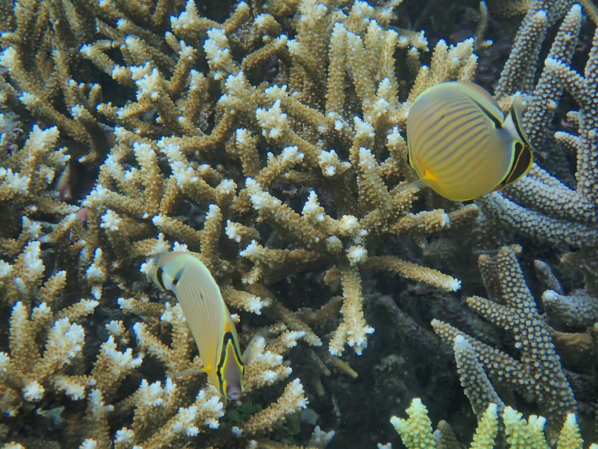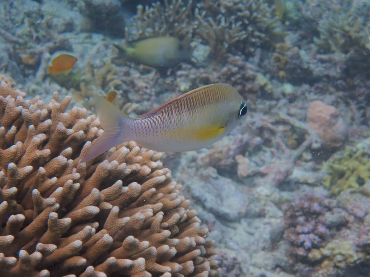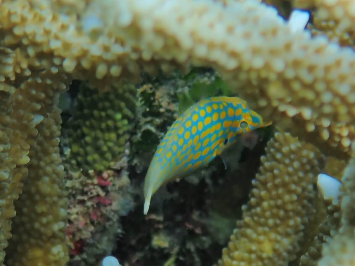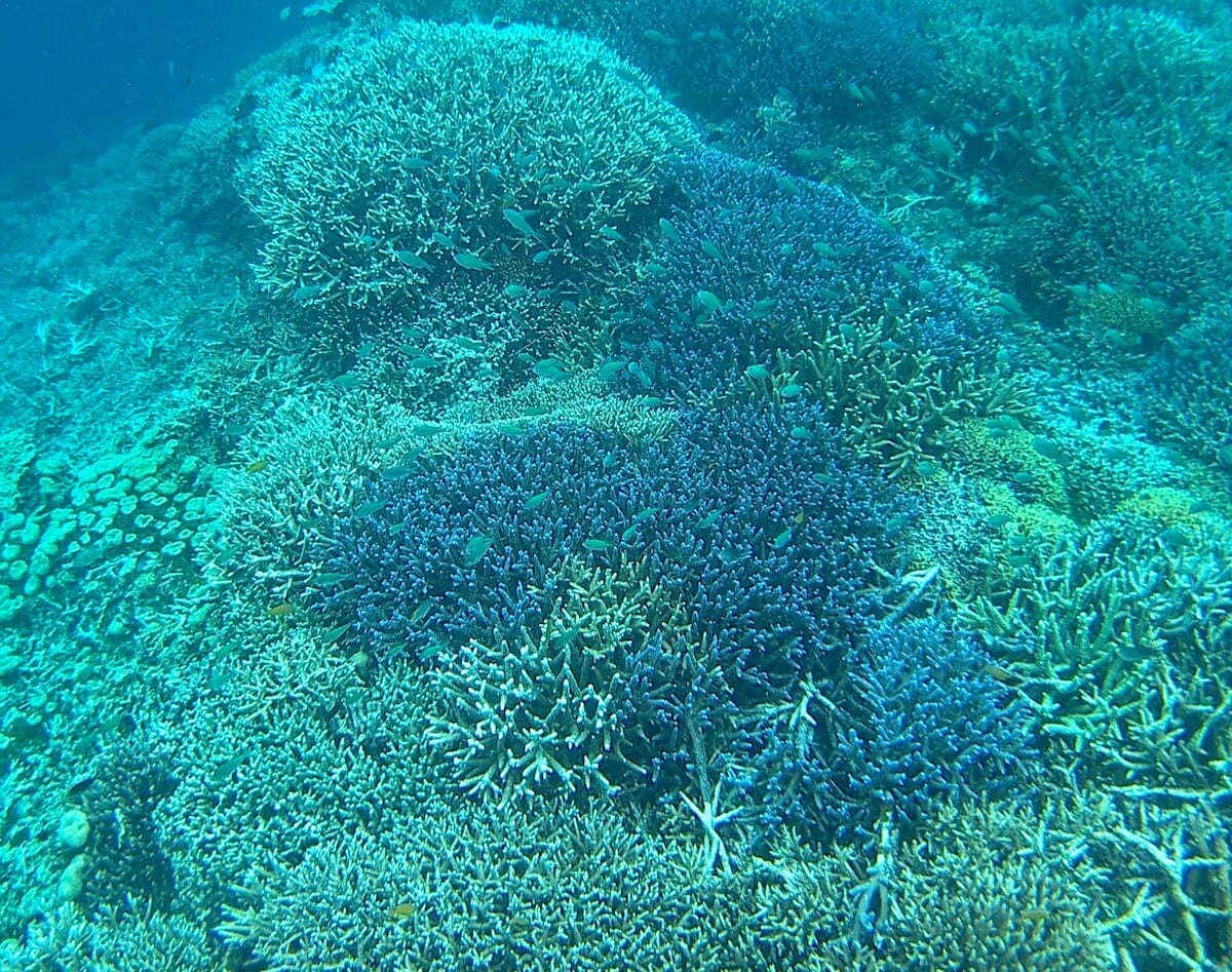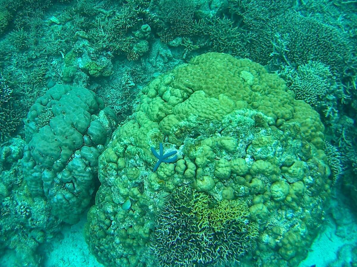 The island is entirely surrounded by a coral reef. Along the western and eastern sides of the island, this majestic reef is covered with hard corals and populated by an interesting amount of fish with the occasional sight of green turtles.