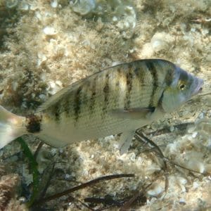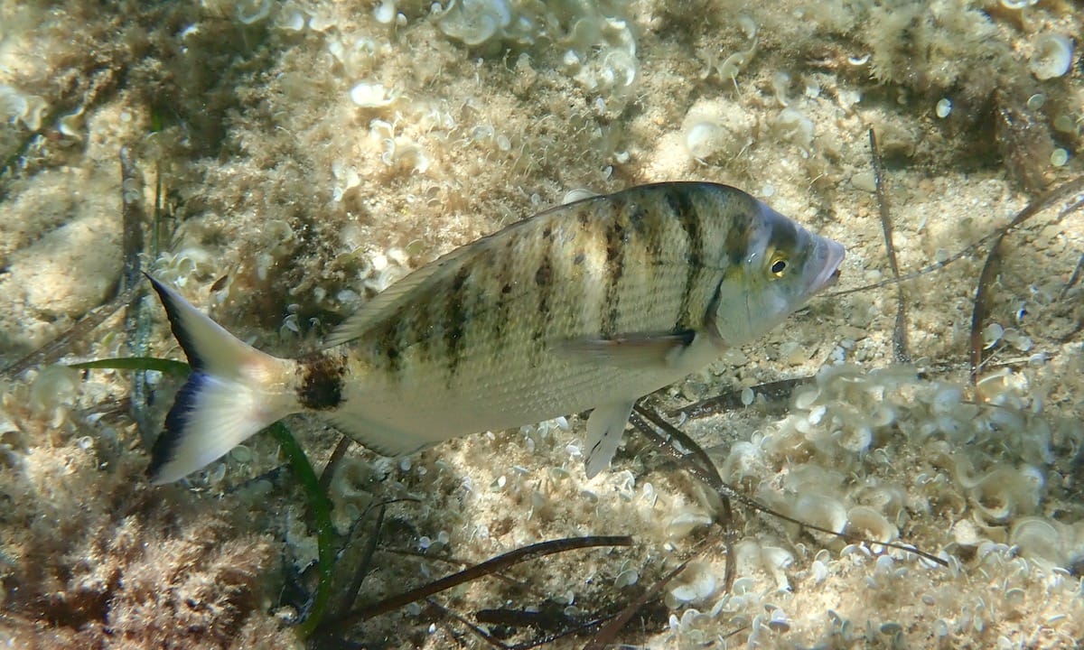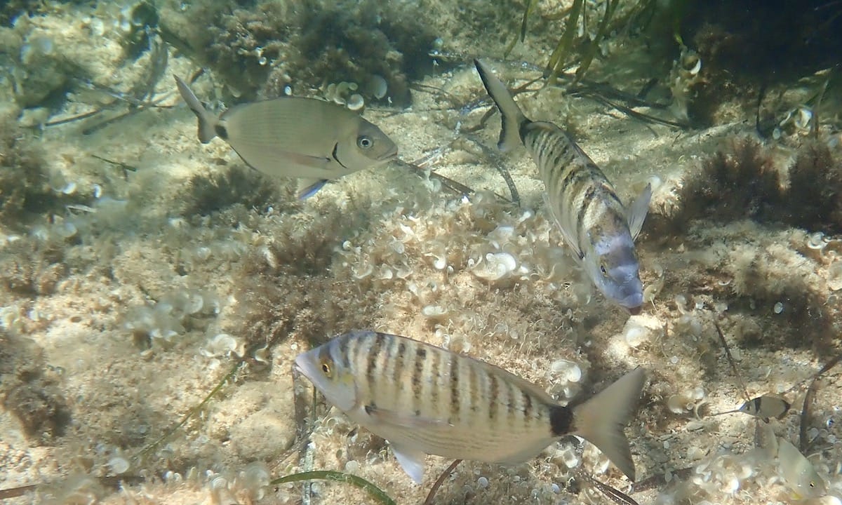 Just in front of the beach, there are rocky bottoms, a few stretches of sand and beautiful posidonia meadows (↕3-6ft/1-2m). Saddled seabream, sargo and sharpsnout bream are common sightings in this area. It is a great area for beginners.