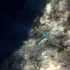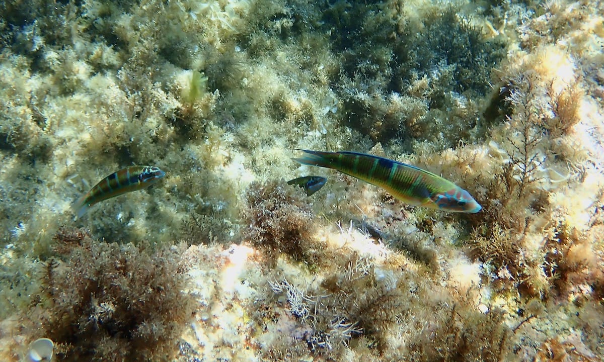Those who wish can then swim to the drop off, which stretches over 200m along the rocky point. You will quickly spot many ornate wrasses bustling around the rocks (↕3-9ft/1-3m), especially in late spring/early summer. Red starfish are common on the wall, sometimes hidden in small cracks.