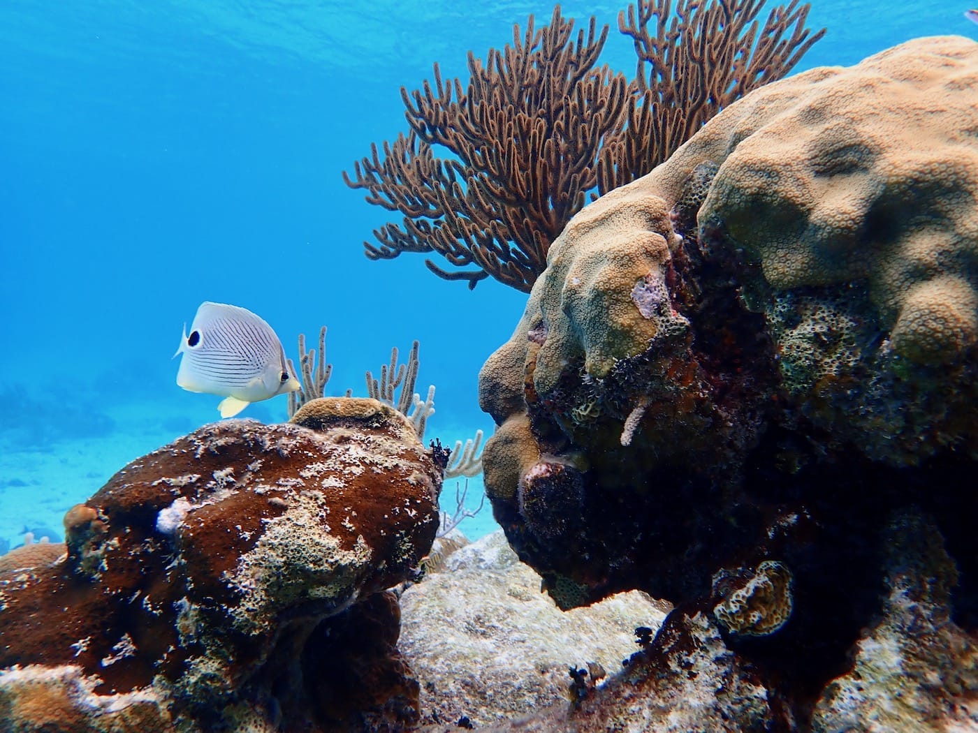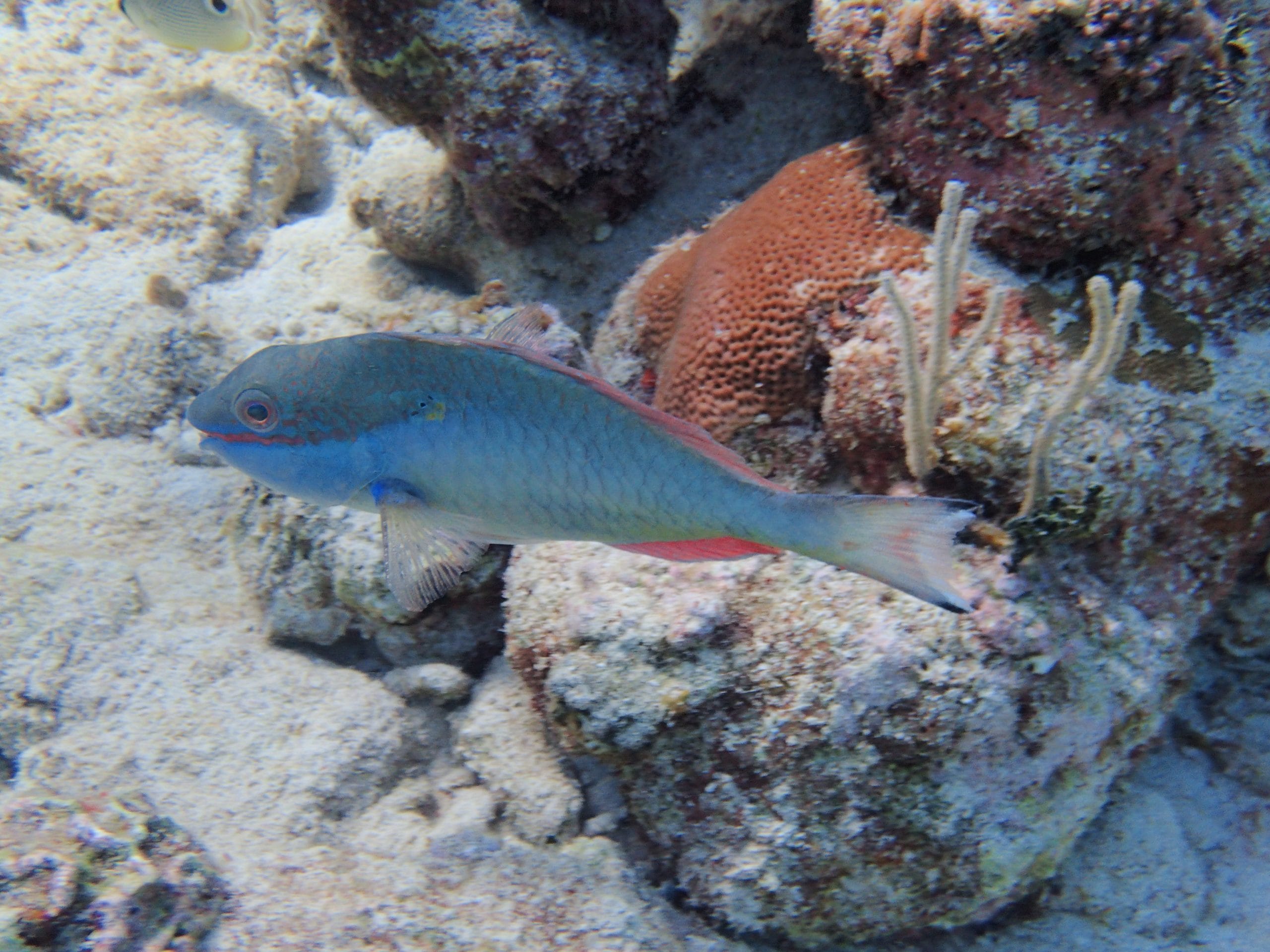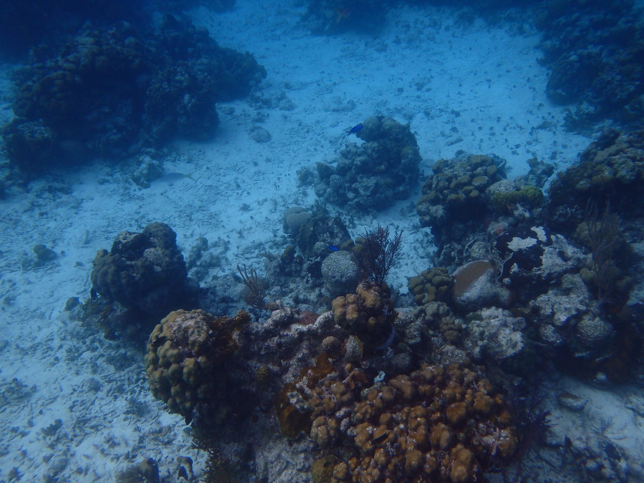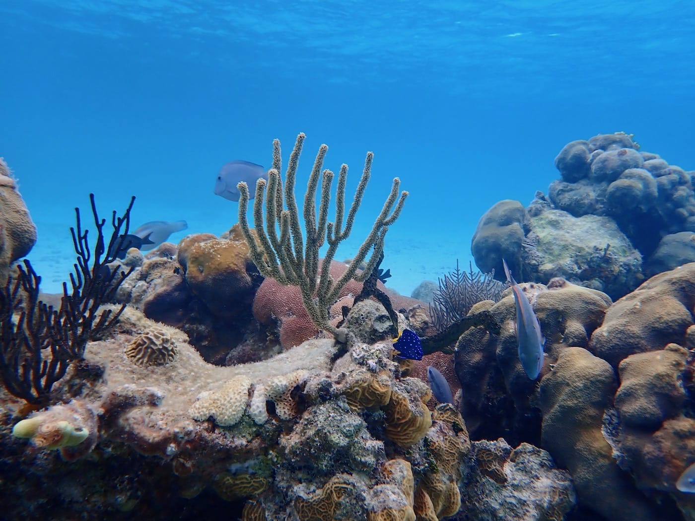 Over the reef itself, you will come across damselfish fighting for their territories, bluehead wrasses darting along the rocks and small groups of sergeant majors that might remain close to you, staring with curiosity. If you’re lucky, you will spot a rock beauty (Holacanthus tricolor), a small but bright-colored fish said to be one of the most beautiful in the Caribbean reefs.