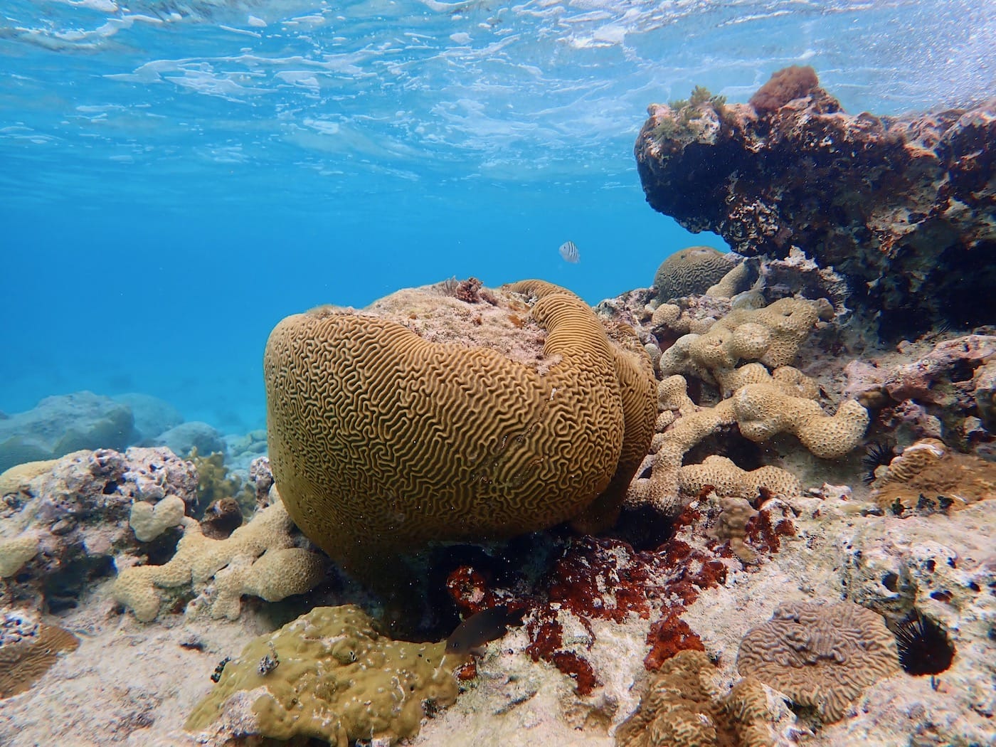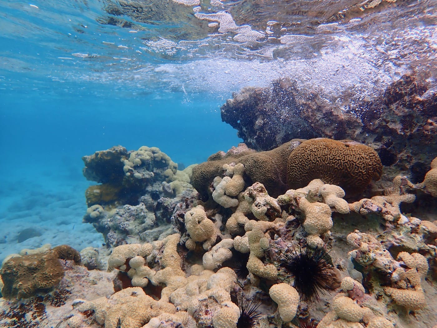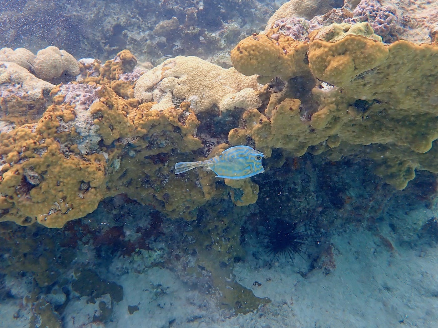 You can explore the whole reef fringing the coast and located about 100 meters from the shore. Once in the water, you will first swim across an uninteresting sandy seabed (↕1-8ft/0.5-2m). Corals then progressively cover it (↕6-12ft/1.5-4m). From here, there will still be about 40 meters to swim to the reef drop-off. This last part isn’t of great interest for snorkelers either because of its very important water depth.