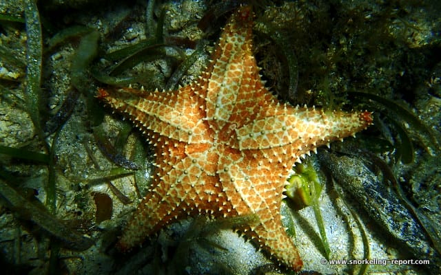 As soon as you will be in the water, you will see large numbers of cushion sea stars on the seagrass. Orange, yellow, beige or bright red, the starfish are photogenic and totally harmless.