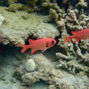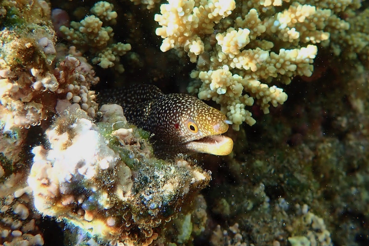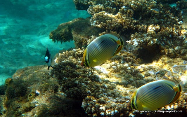 You need to go a little further to reach the coral areas (↕2-6ft/0,5-2m). You will never tire of swimming between the Acropora beds, following one of the Moorish idols, pufferfish, or raccoon butterflyfish you are likely to encounter.