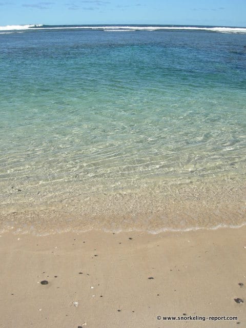 You can enter the water anywhere along the beach, but you should choose the bathing area (shown by small buoys), which is cleared of the lagoon’s sea urchins every day. The 200 to 300 meters of beach stretching away to your right (as you are facing the ocean) from the marina dyke is probably the most interesting location for snorkeling.