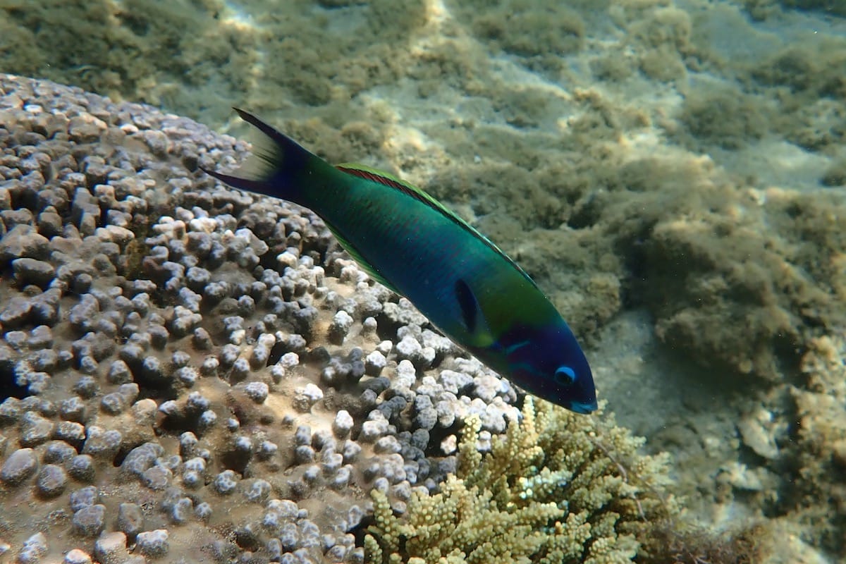 The area to explore covers the inner part of the lagoon, from the beach to the barrier reef. The first few meters from the beach are sandy (↕2-4ft/0.5-1m), with a few fish here and there, including lagoon triggerfish, which fiercely protect their nests during the mating season.