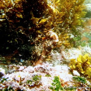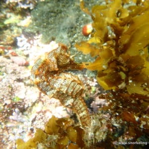 Some parts of the walls are covered with sargassum, which is the habitat of Pacific seahorses. However, although their presence is common in Tagus Cove shallows (except when the water gets too warm, in particular during El Niño events), seahorses are difficult to spot since they are well camouflaged in the seagrass.