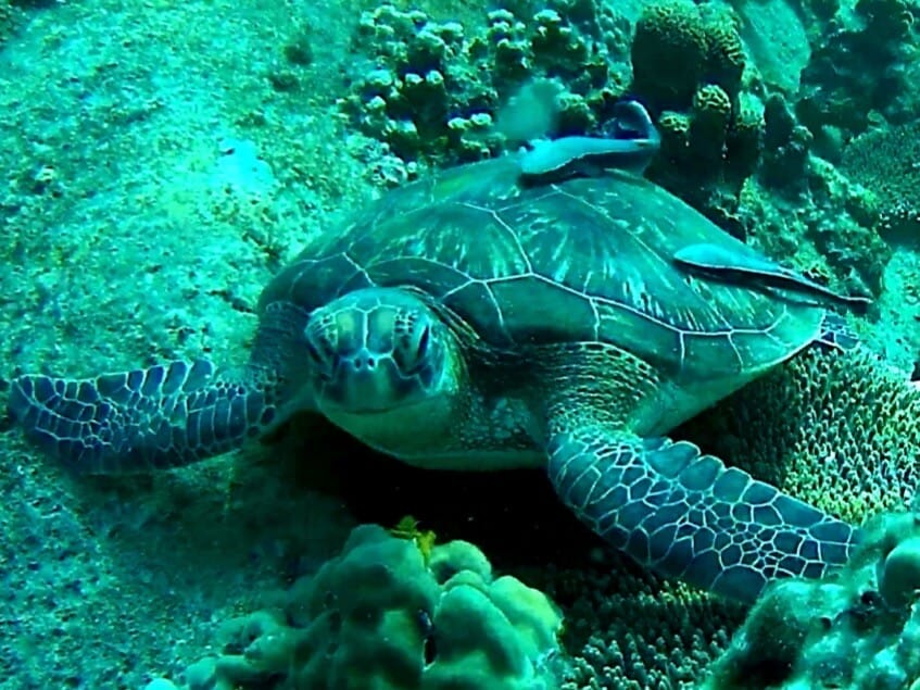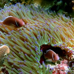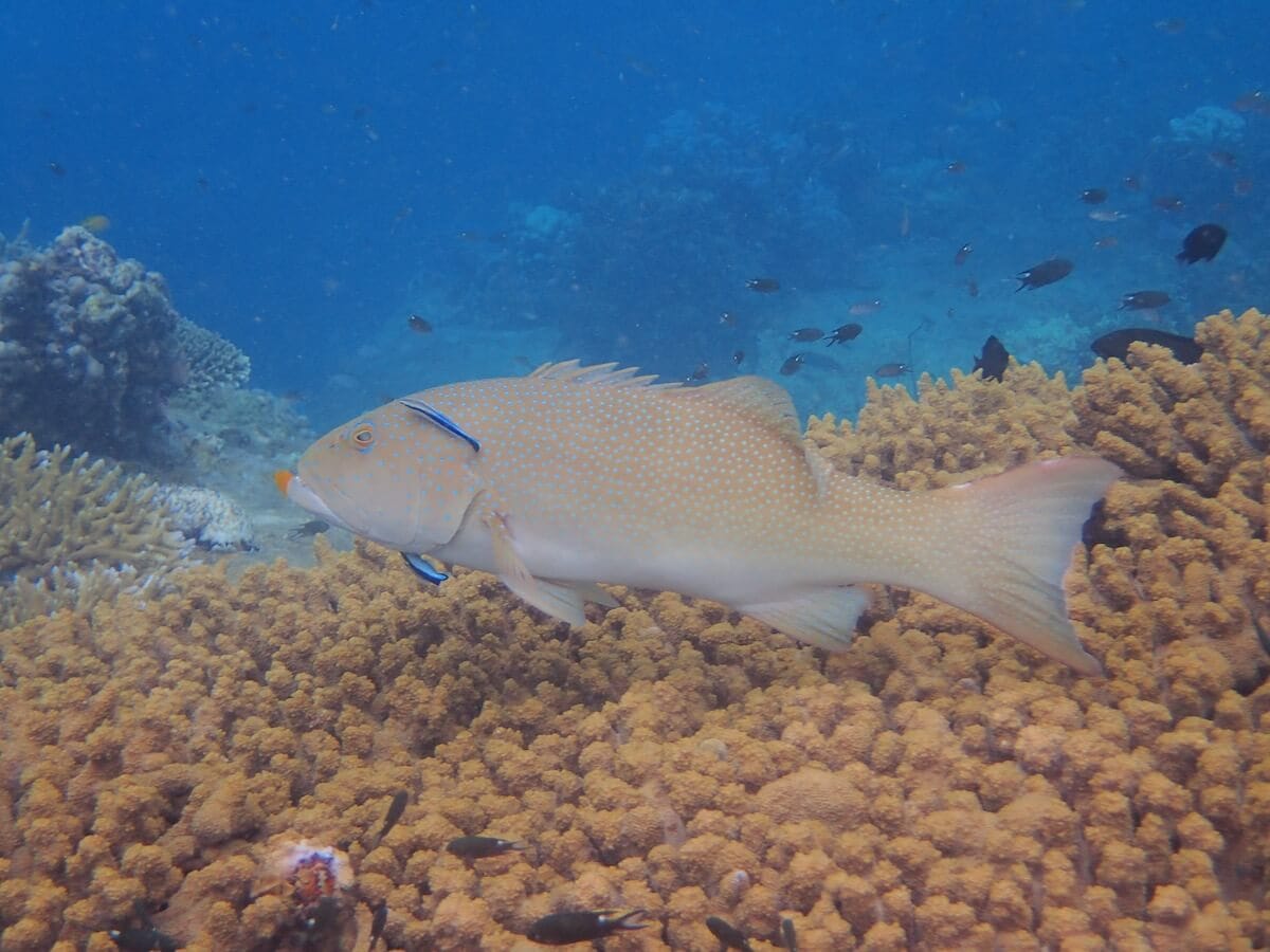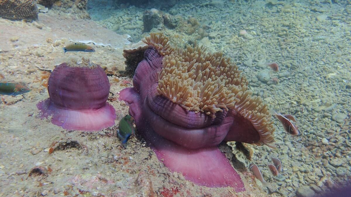 Snorkel around the boulders and pinnacles where giant clams, Christmas tree worms and sea anemones inhabited by pink skunk clownfish find shelter. If you look carefully in the cracks, you may spot small moray eels, while wrasses, rabbitfish, and several species of parrotfish can be encountered everywhere.