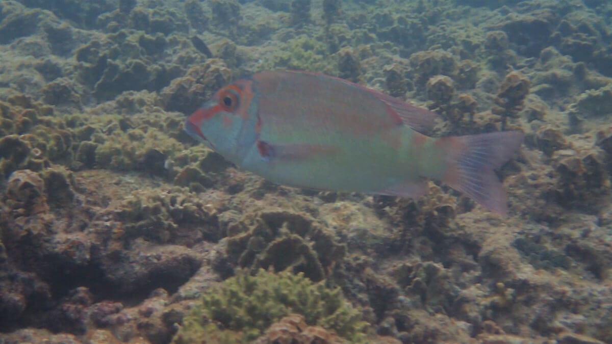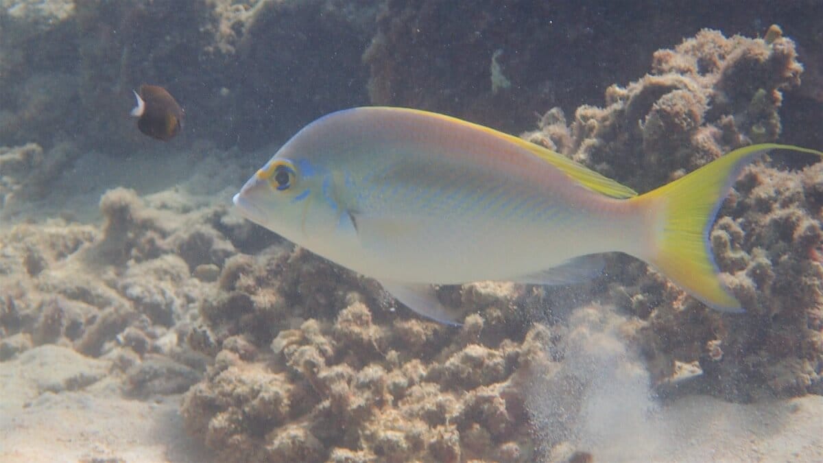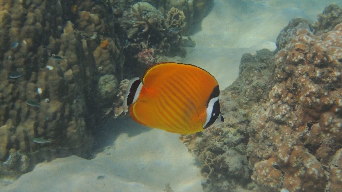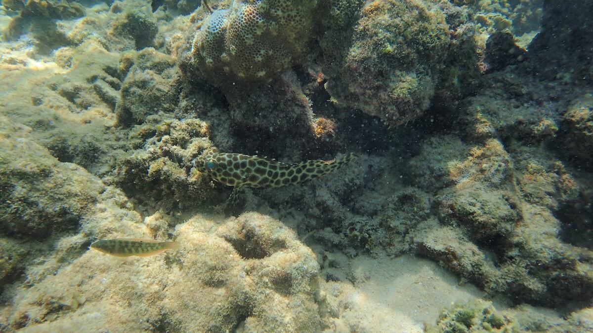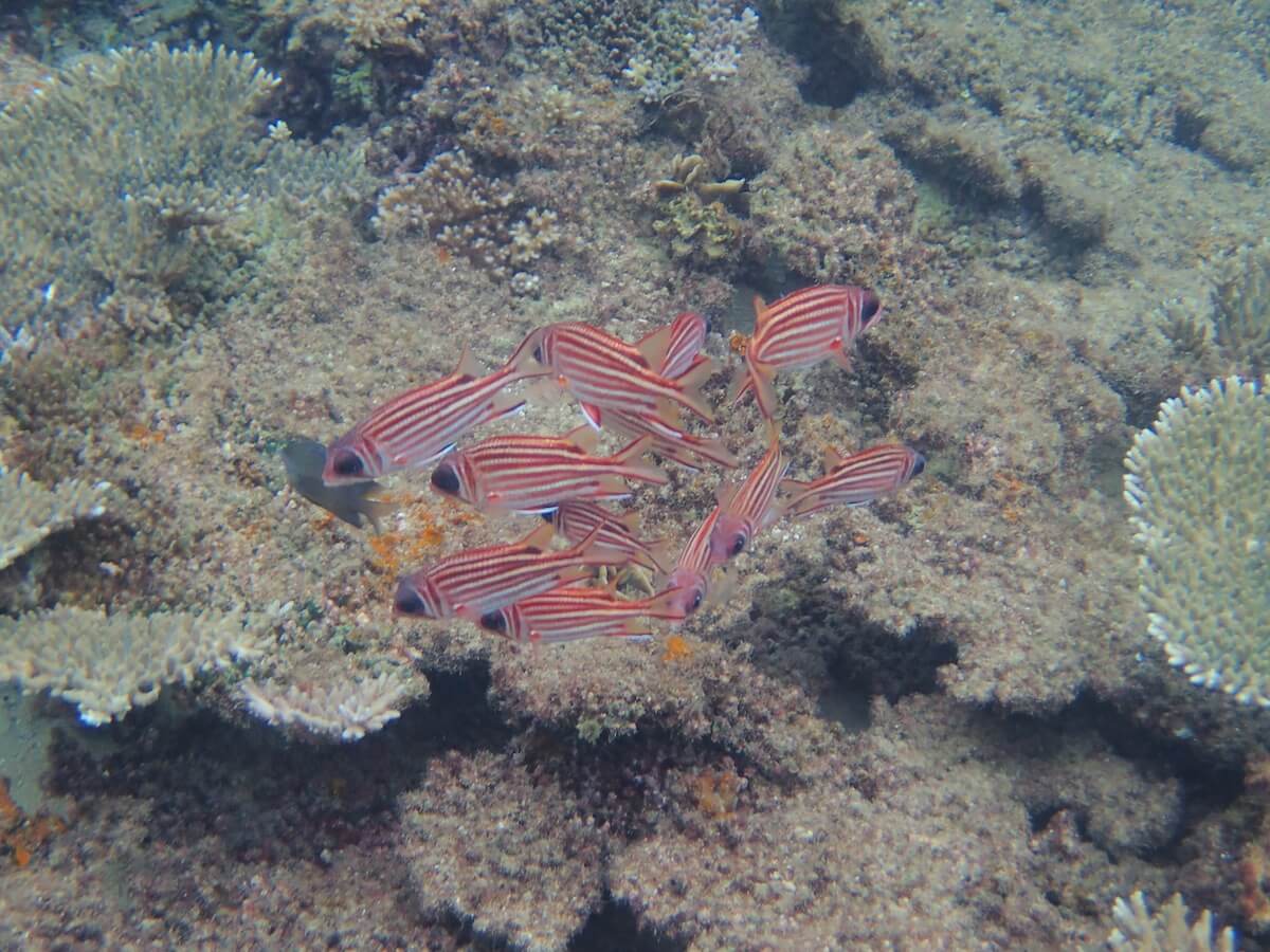 Dozens of fish species call the little bay home, including several butterflyfish species (Hong Kong butterflyfish, eightband butterflyfish), scrawled filefish, harlequin sweetlips and groupers.