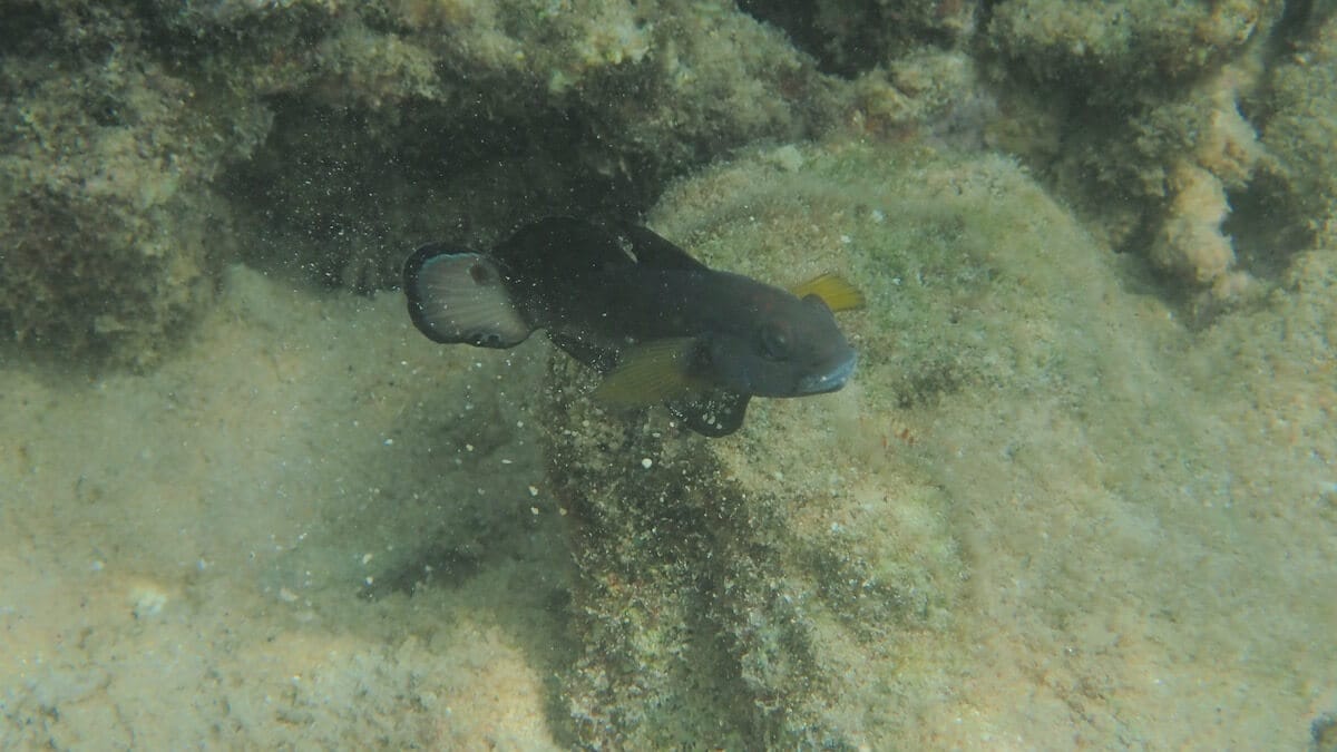 The water is pretty shallow near the beach then quickly drops off to about 9-12ft/3-4 meters. The whole bay is worth snorkeling, but sea life is more abundant along the giant boulders on either side and in the middle of the bay. Small coral is found on most of the boulders and the fish love to hide in and around them.