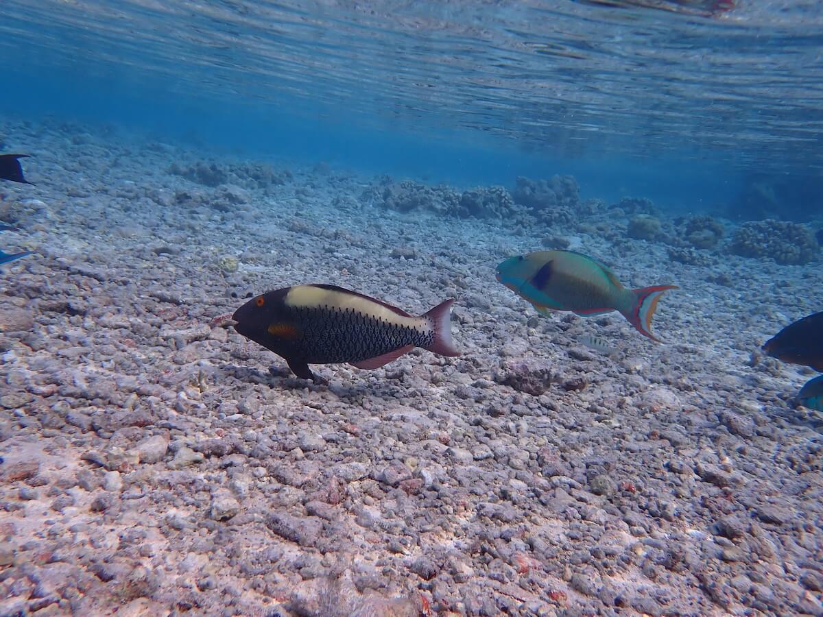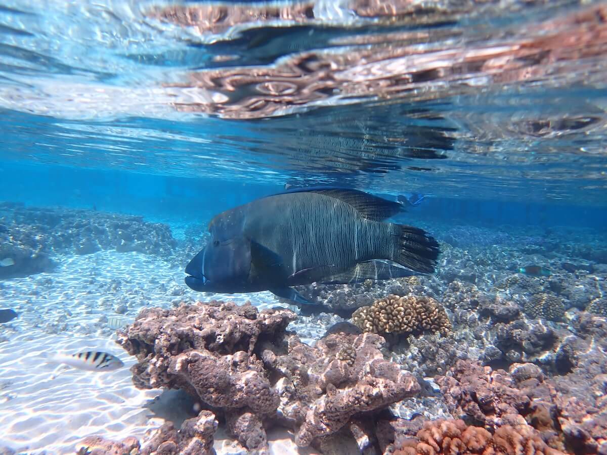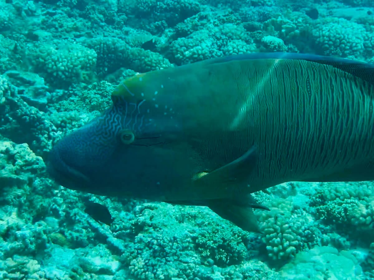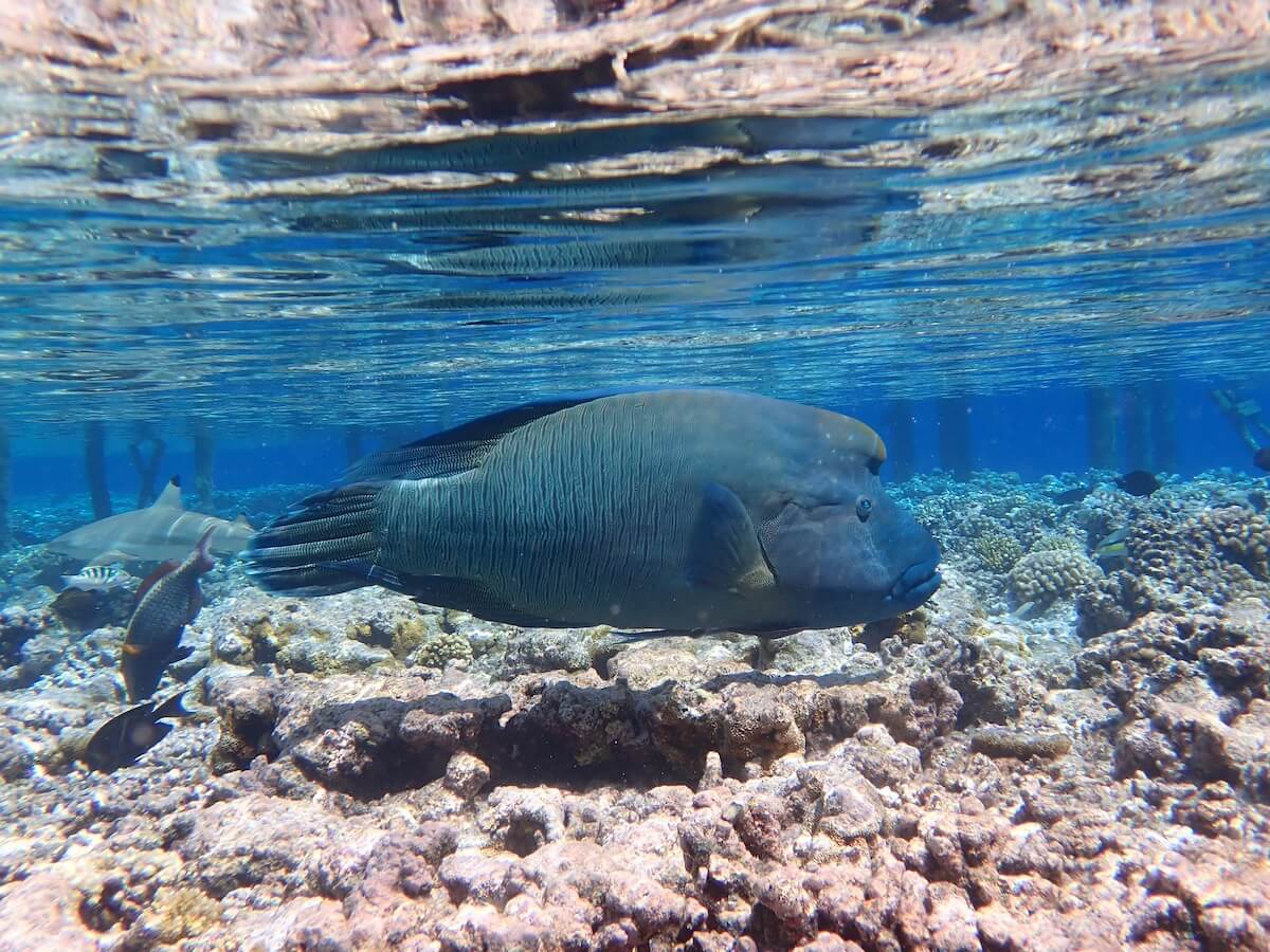 Around 15 individuals, including 2 or 3 bright green terminal phase males, live around the village. Peaceful and inquisitive, swimming with this unique fish will leave you with an unforgettable memory.