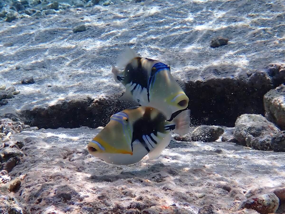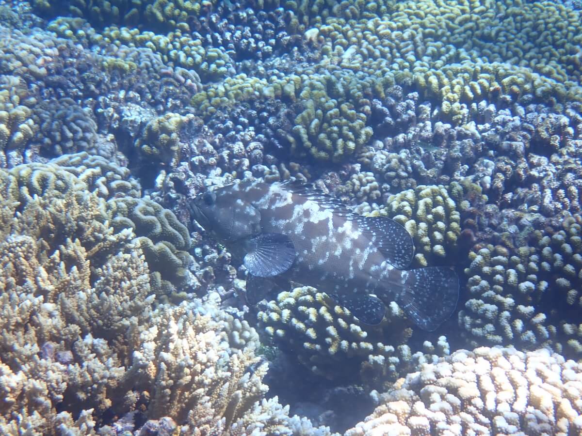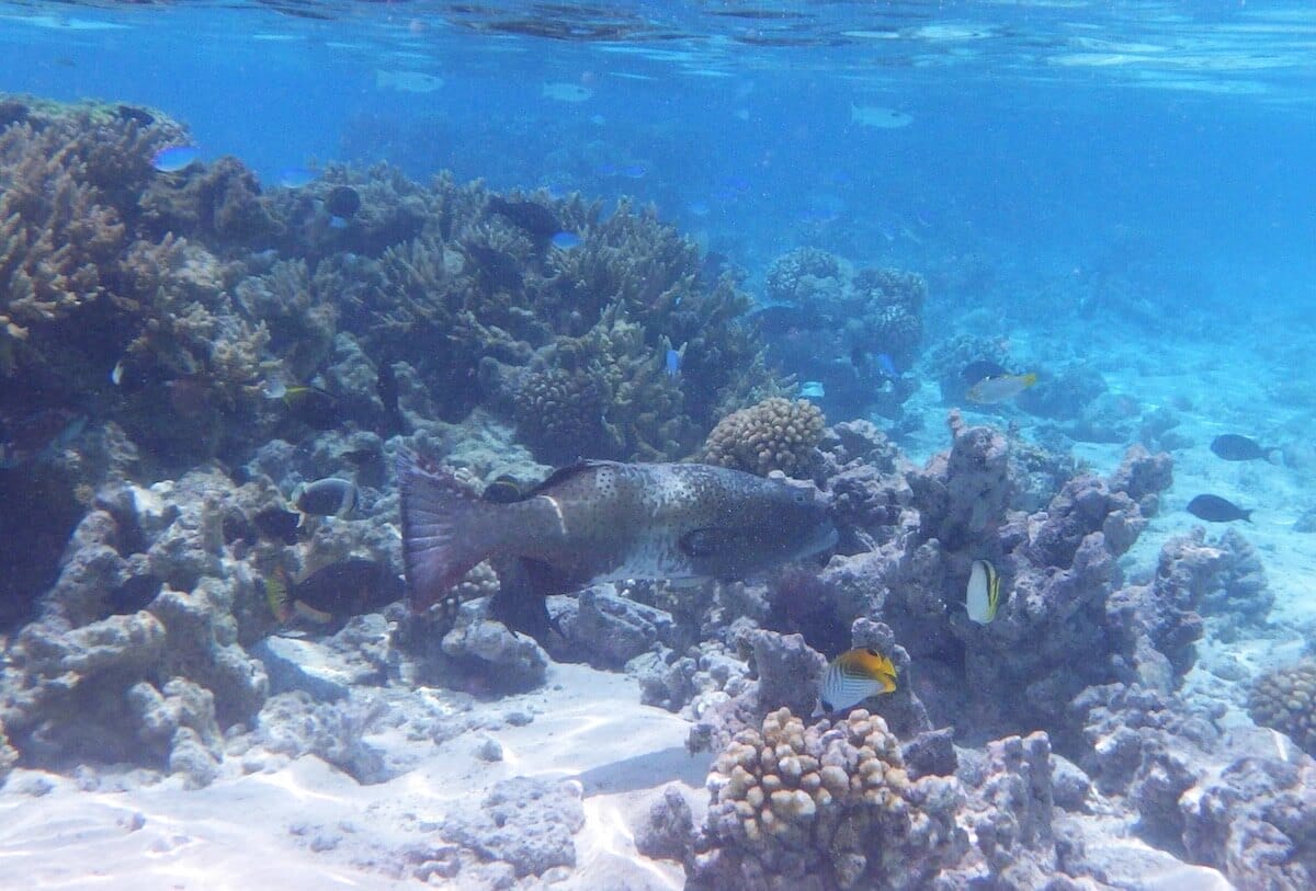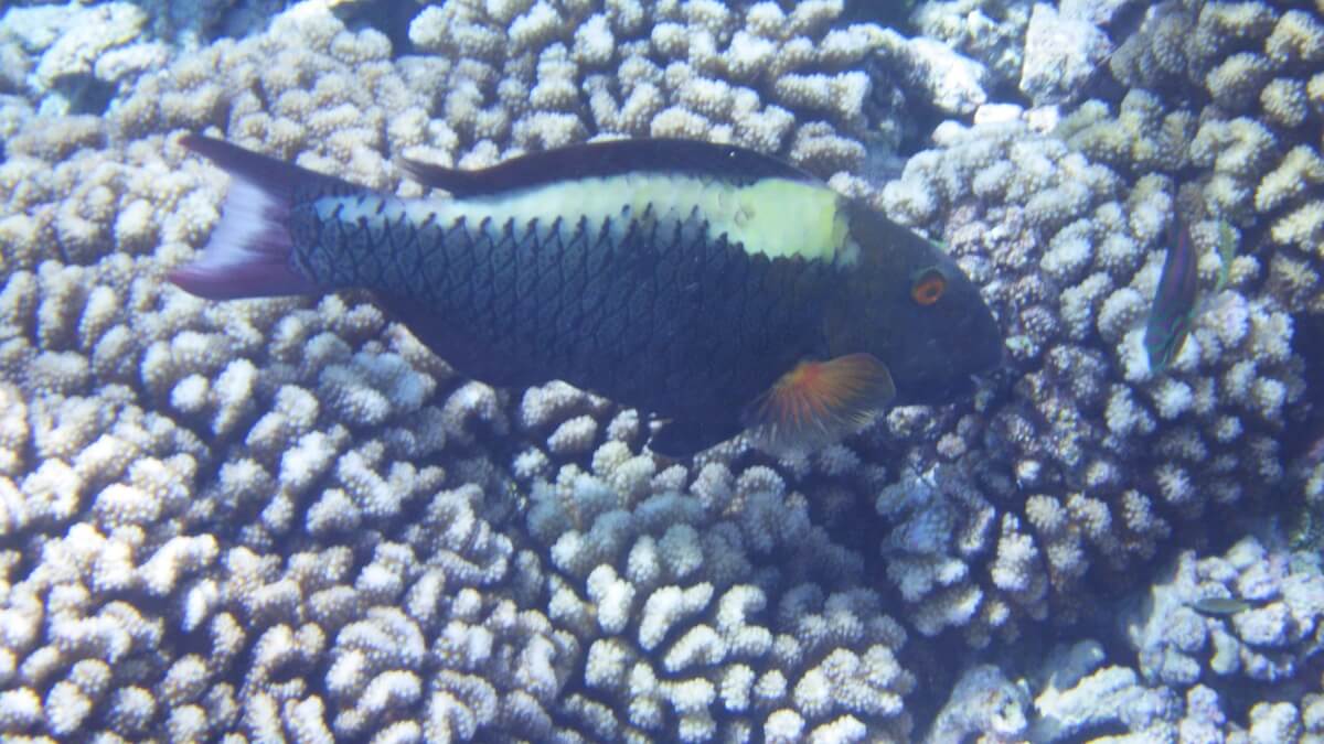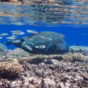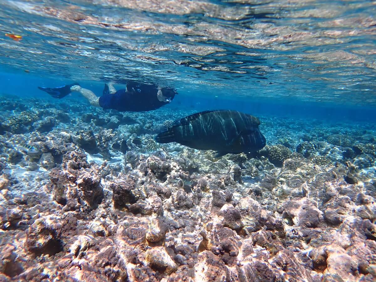 Around 15 individuals, including 2 or 3 bright green terminal phase males, live around the village. Peaceful and inquisitive, swimming with this unique fish will leave you with an unforgettable memory.