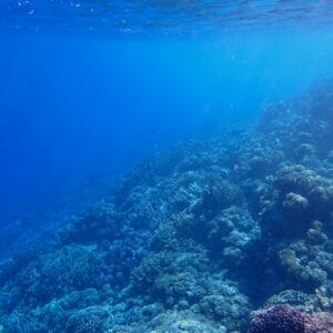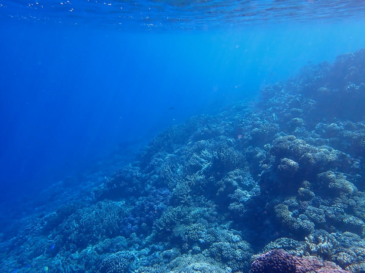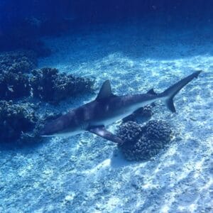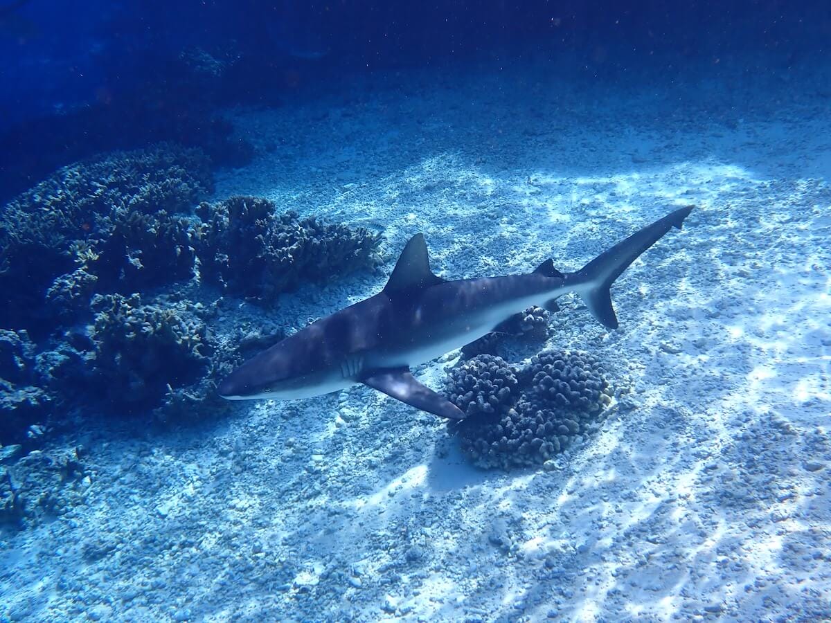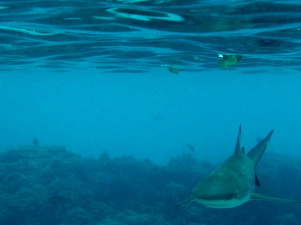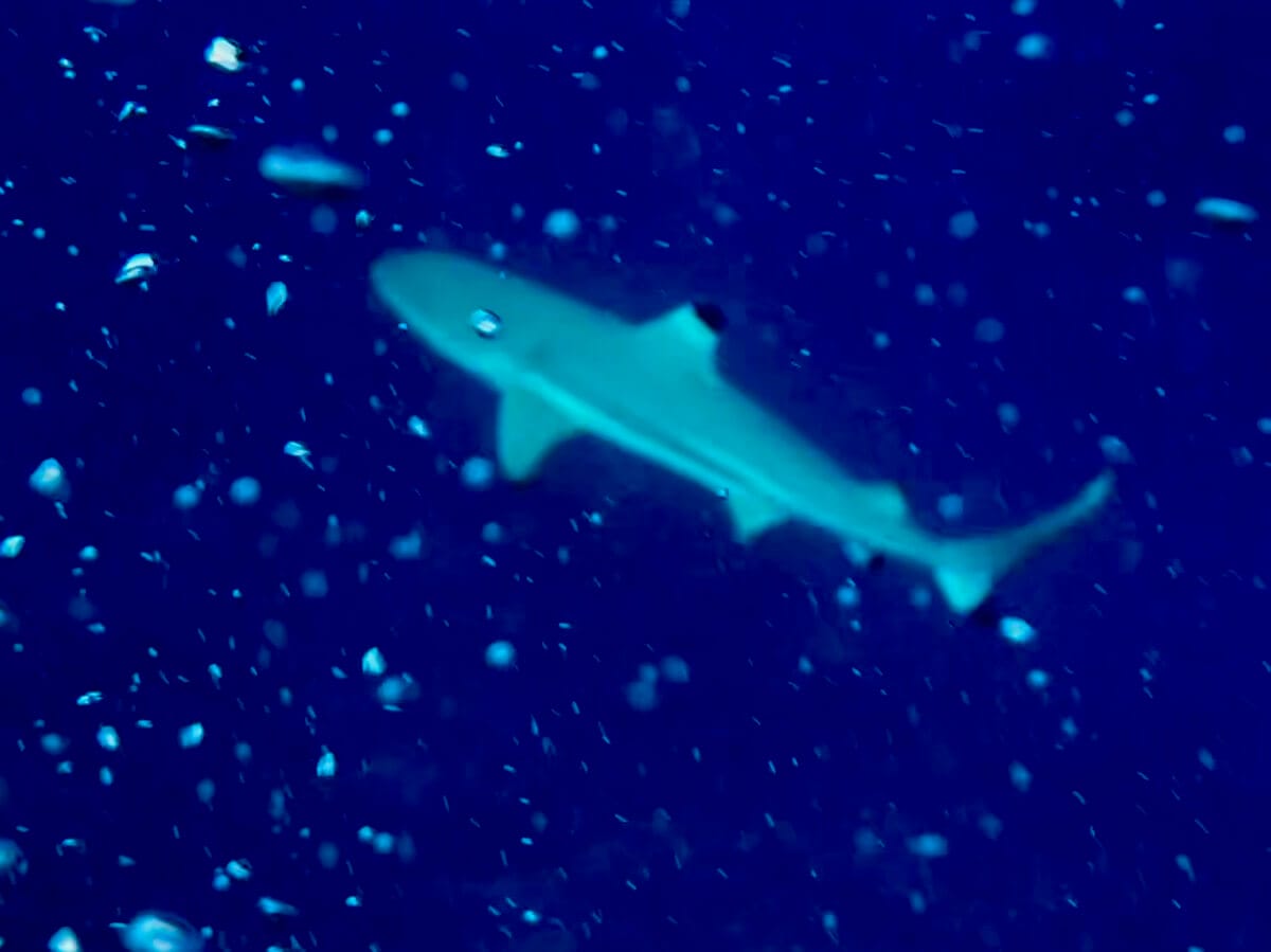If you start from the white buoy, you will snorkel over the “shark wall” (↕65ft/20m), where about a hundred grey reef sharks patrol in the current. If you are lucky, you may spot in the blue, green sea turtles, manta rays, or other species of sharks including occasional sicklefin sharks.