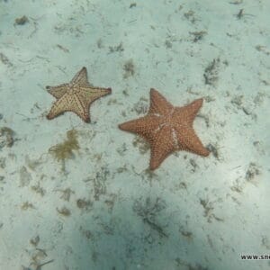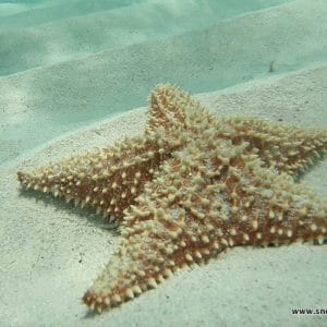Beyond this area, you will start to see dozens of Cushion sea stars (Oreaster reticulatus) lying on the sand and in the seagrass (↕10-13ft/3-4m). It is the most common sea star in the shallow waters of the Caribbean.