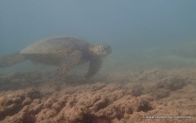 Kuilima Cove, also known as Turtle Bay, is a small, shallow bay on the North Shore of Oahu, Hawaii. While this area is sheltered from the waves, the seabed is quite poor in the bay. It is just sand, rock and a small coral patches. Even so, it is relatively easy to see green turtles and a good variety of fish in just a few feet of water.
