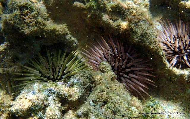 You enter the water from the sandy beach of the hotel. You should opt for the area to the right as you are looking out to sea, near the bar of black rocks, where the water is the calmest. Watch out for the many sea urchins living in the rock crevices.